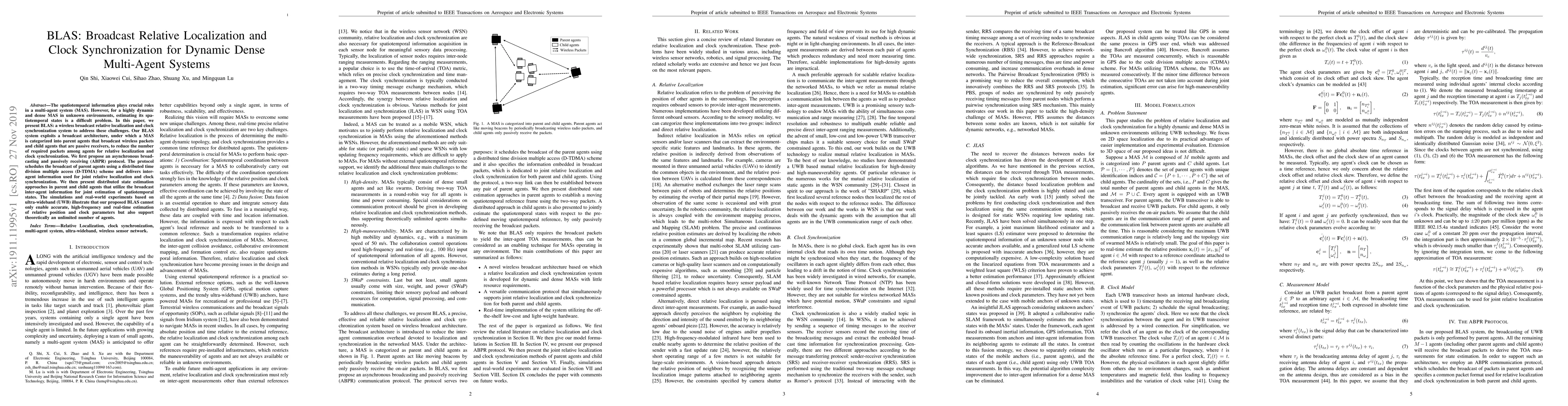 This paper introduces BLAS, a wireless broadcast system for relative localization and clock synchronization in dynamic dense multi-agent systems. It employs an ABPR protocol with D-TDMA for efficient packet broadcasting and distributed state estimation to achieve accurate spatiotemporal state estimation, supported by simulations and real-world ultra-wideband experiments.