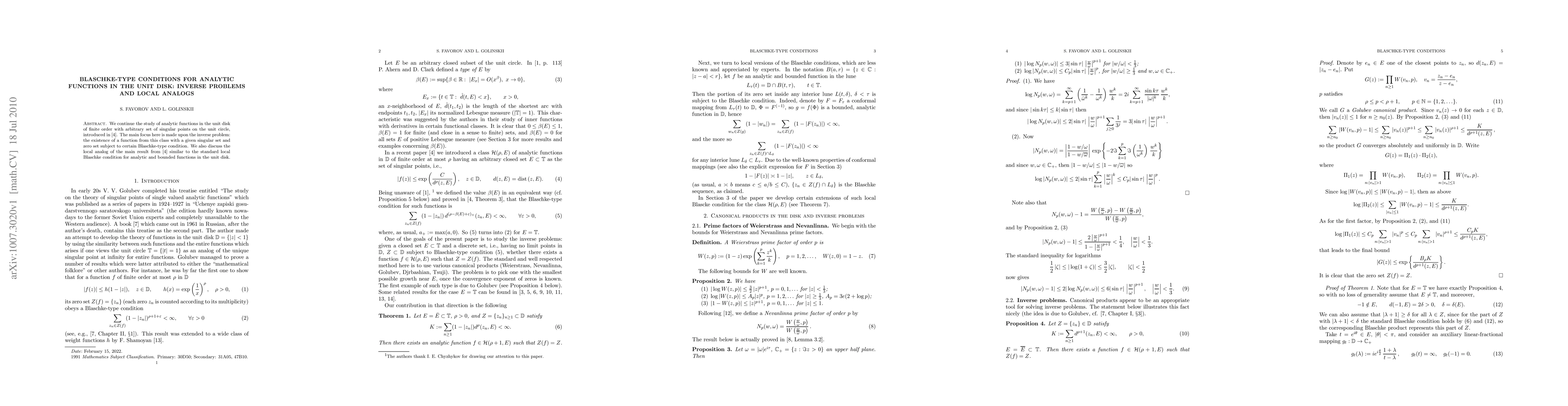 We continue the study of analytic functions in the unit disk of finite order with arbitrary set of singular points on the unit circle, introduced in \cite{FG}. The main focus here is made upon the inverse problem: the existence of a function from this class with a given singular set and zero set subject to certain Blaschke-type condition. We also discuss the local analog of the main result from \cite{FG} similar to the standard local Blaschke condition for analytic and bounded functions in the unit disk.