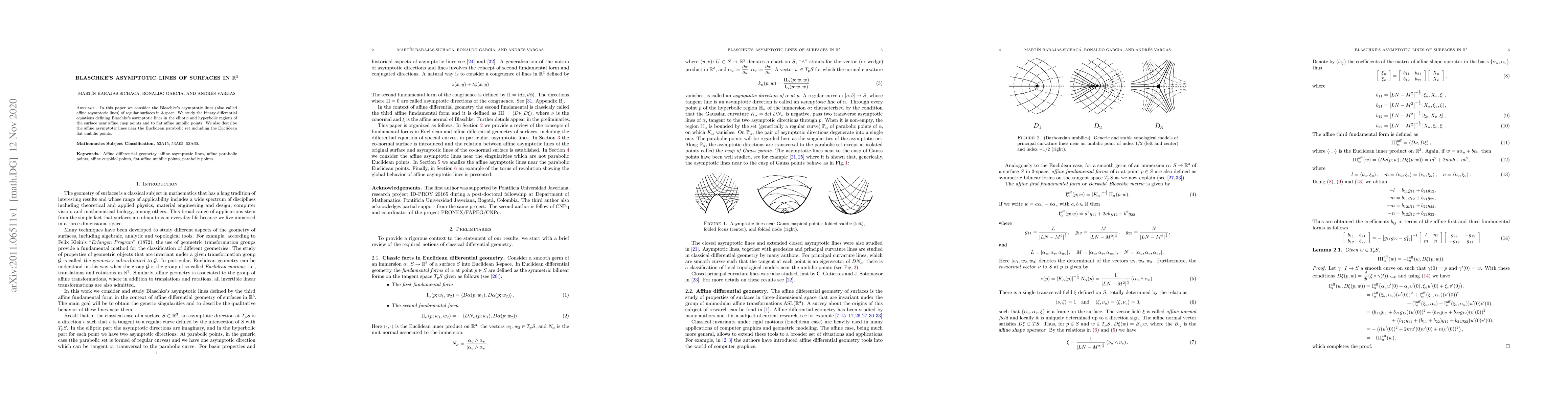 In this paper we consider the Blaschke's asymptotic lines (also called affine asymptotic lines) of regular surfaces in 3-space. We study the binary differential equations defining Blaschke's asymptotic lines in the elliptic and hyperbolic regions of the surface near affine cusp points and to at affine umbilic points. We also describe the affine asymptotic lines near the Euclidean parabolic set including the Euclidean flat umbilic points.