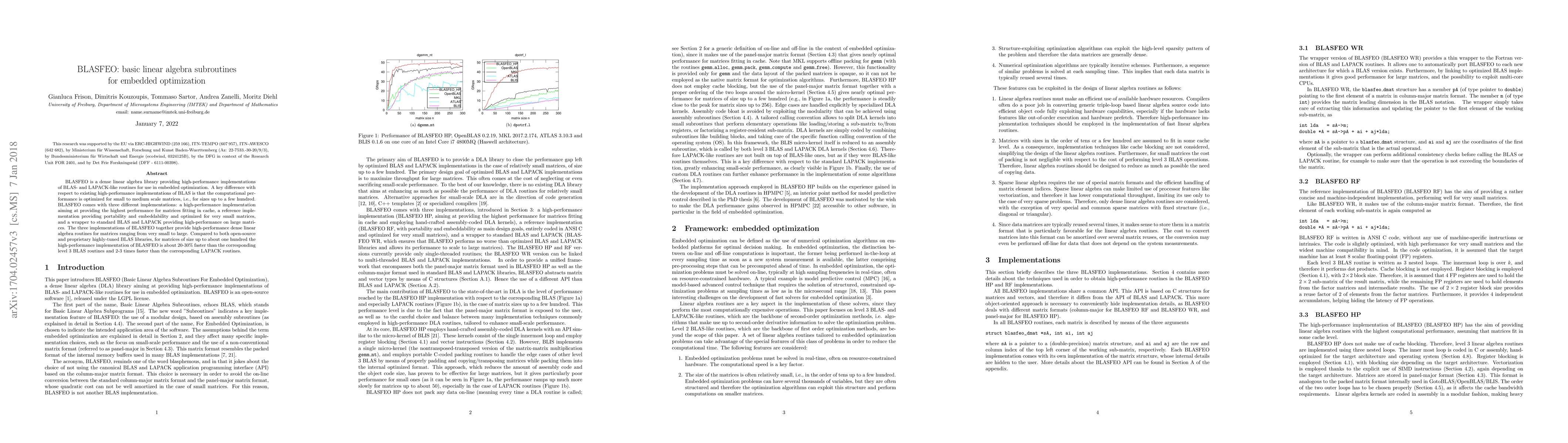 The technical contribution of this work is BLASFEO, a library of BLAS- and LAPACK-like routines optimized for small to medium scale matrices, providing significant performance improvements for embedded optimization tasks.