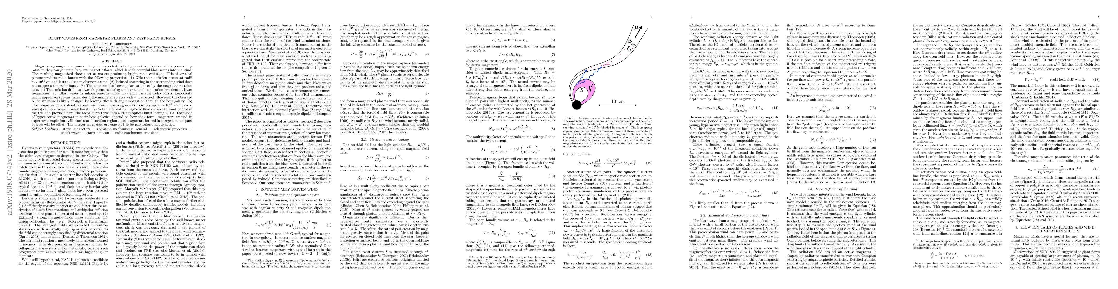 This paper explores the generation of fast radio bursts (FRBs) from magnetar flares, linking them to powerful blast waves and internal shocks. The study predicts that FRBs exhibit GHz radio emissions, linear polarization, and frequency drifts, with potential optical flashes when flares intersect previous wind bubbles.