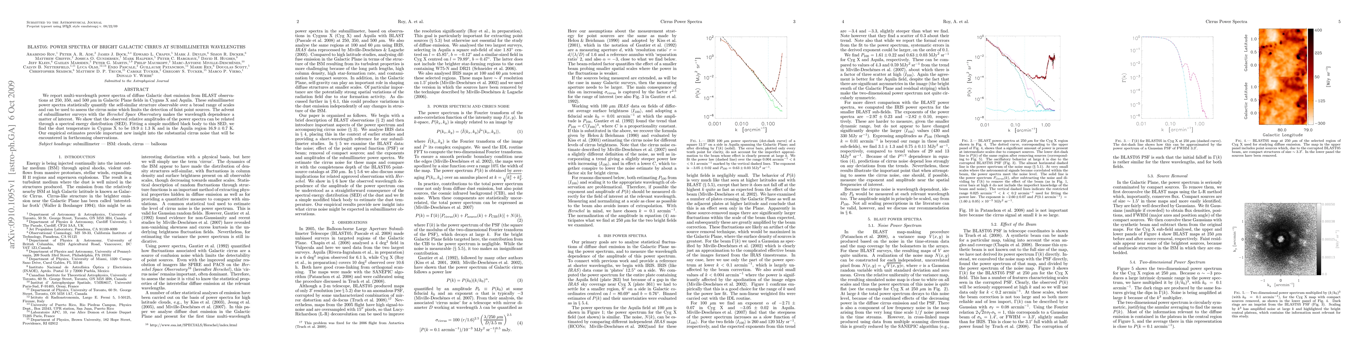 This paper reports multi-wavelength power spectra from BLAST observations of bright Galactic cirrus at submillimeter wavelengths, revealing self-similar structure across scales and providing estimates for dust temperatures in Cygnus X and Aquila regions. These findings are crucial for understanding cirrus noise affecting future submillimeter surveys.