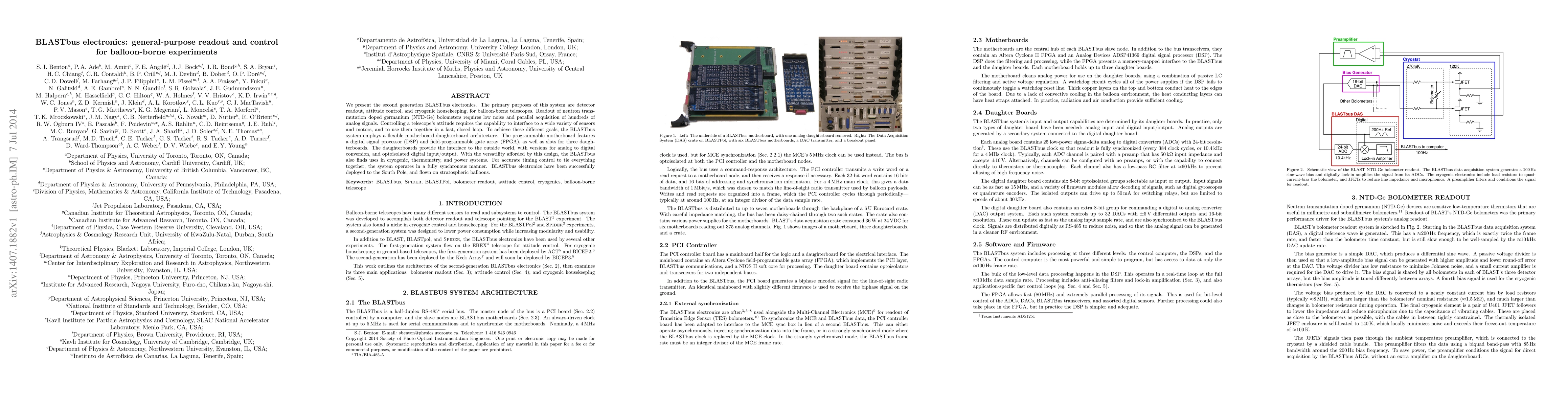 The BLASTbus electronics are a second-generation system designed for detector readout, attitude control, and cryogenic management in balloon-borne telescopes, utilizing a flexible motherboard-daughterboard architecture with DSP and FPGA for signal processing. Successfully deployed in the South Pole and flown on balloons, it integrates various sensors and motors for precise control.