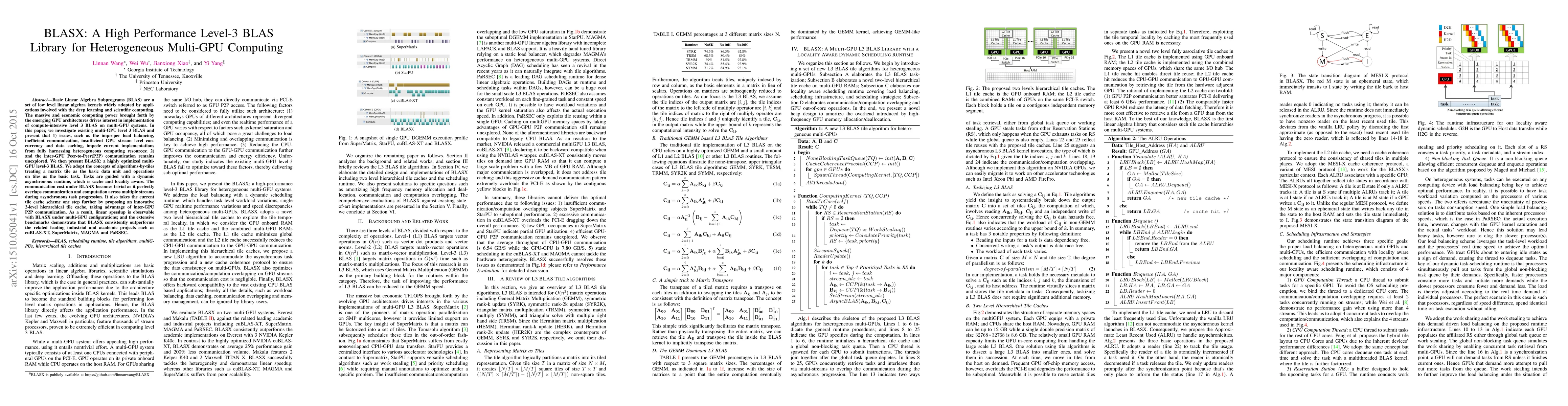 This paper introduces BLASX, a high-performance level-3 BLAS library for multi-GPU computing, addressing issues like load balancing and communication inefficiencies in existing implementations. BLASX employs a tile-based algorithm and dynamic asynchronous runtime to optimize resource utilization and achieve linear speedup, outperforming other leading libraries in benchmarks.