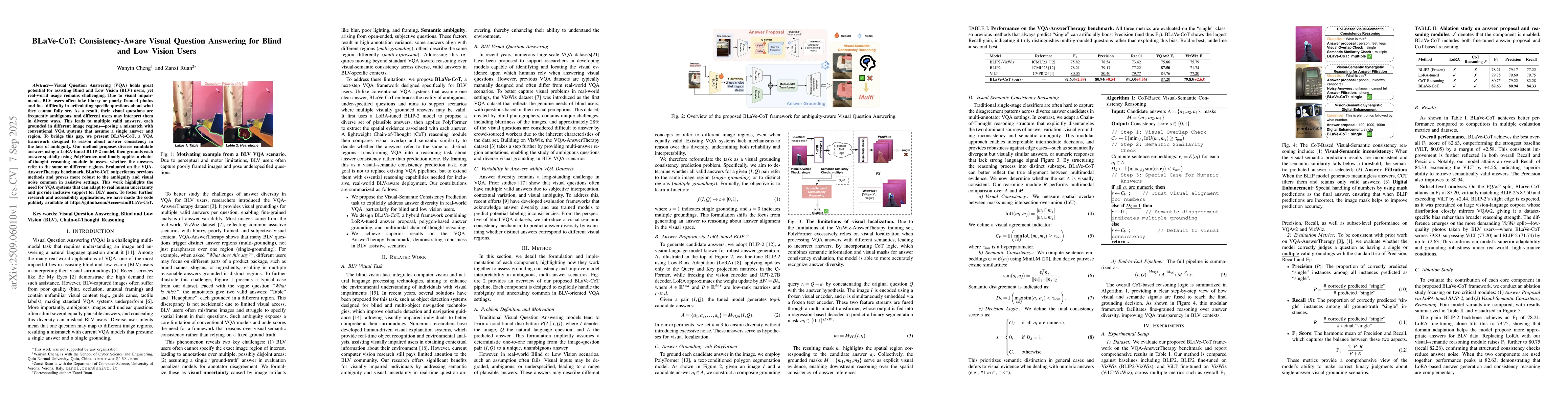 Visual Question Answering (VQA) holds great potential for assisting Blind and Low Vision (BLV) users, yet real-world usage remains challenging. Due to visual impairments, BLV users often take blurry or poorly framed photos and face difficulty in articulating specific questions about what they cannot fully see. As a result, their visual questions are frequently ambiguous, and different users may interpret them in diverse ways. This leads to multiple valid answers, each grounded in different image regions-posing a mismatch with conventional VQA systems that assume a single answer and region. To bridge this gap, we present BLaVe-CoT, a VQA framework designed to reason about answer consistency in the face of ambiguity. Our method proposes diverse candidate answers using a LoRA-tuned BLIP-2 model, then grounds each answer spatially using PolyFormer, and finally applies a chain-of-thought reasoning module to assess whether the answers refer to the same or different regions. Evaluated on the VQA-AnswerTherapy benchmark, BLaVe-CoT outperforms previous methods and proves more robust to the ambiguity and visual noise common in assistive settings. This work highlights the need for VQA systems that can adapt to real human uncertainty and provide inclusive support for BLV users. To foster further research and accessibility applications, we have made the code publicly available at https://github.com/Accecwan/BLaVe-CoT.