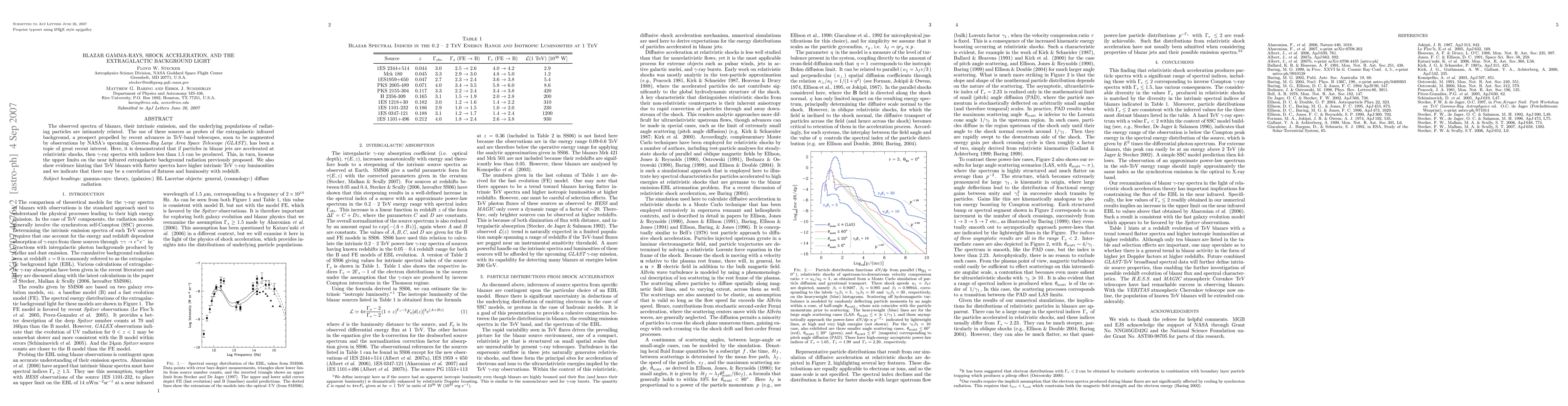 The observed spectra of blazars, their intrinsic emission, and the underlying populations of radiating particles are intimately related. The use of these sources as probes of the extragalactic infrared background, a prospect propelled by recent advances in TeV-band telescopes, soon to be augmented by observations by NASA's upcoming Gamma-Ray Large Area Space Telescope (GLAST), has been a topic of great recent interest. Here, it is demonstrated that if particles in blazar jets are accelerated at relativistic shocks, then gamma-ray spectra with indices less than 1.5 can be produced. This, in turn, loosens the upper limits on the near infrared extragalactic background radiation previously proposed. We also show evidence hinting that TeV blazars with flatter spectra have higher intrinsic TeV gamma-ray luminosities and we indicate that there may be a correlation of flatness and luminosity with redshift.