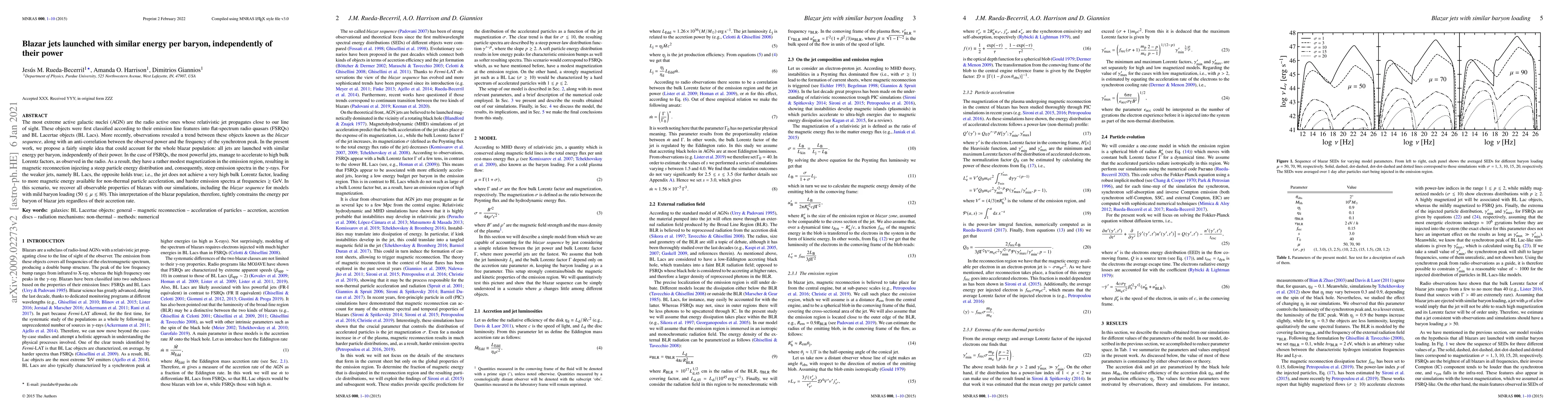 The most extreme active galactic nuclei (AGN) are the radio active ones whose relativistic jet propagates close to our line of sight. These objects were first classified according to their emission line features into flat-spectrum radio quasars (FSRQs) and BL Lacertae objects (BL Lacs). More recently, observations revealed a trend between these objects known as the \emph{blazar sequence}, along with an anti-correlation between the observed power and the frequency of the synchrotron peak. In the present work, we propose a fairly simple idea that could account for the whole blazar population: all jets are launched with similar energy per baryon, independently of their power. In the case of FSRQs, the most powerful jets, manage to accelerate to high bulk Lorentz factors, as observed in the radio. As a result, they have a rather modest magnetization in the emission region, resulting in magnetic reconnection injecting a steep particle energy distribution and, consequently, steep emission spectra in the $\gamma$-rays. For the weaker jets, namely BL Lacs, the opposite holds true; i.e., the jet does not achieve a very high bulk Lorentz factor, leading to more magnetic energy available for non-thermal particle acceleration, and harder emission spectra at frequencies $\gtrsim$ GeV. In this scenario, we recover all observable properties of blazars with our simulations, including the \emph{blazar sequence} for models with mild baryon loading ($50 \lesssim \mu \lesssim 80$). This interpretation of the blazar population, therefore, tightly constrains the energy per baryon of blazar jets regardless of their accretion rate.