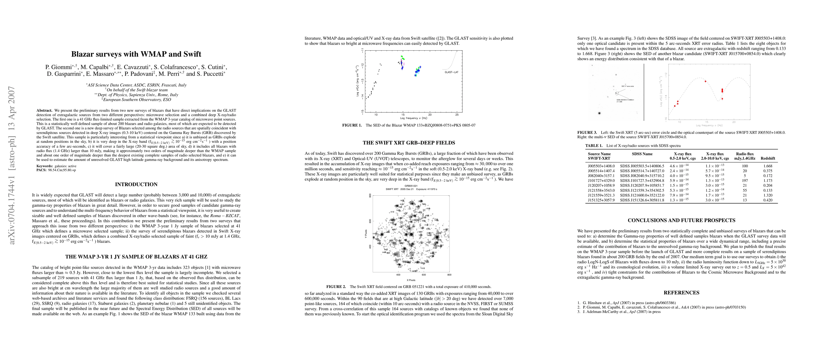 We present the preliminary results from two new surveys of blazars that have direct implications on the GLAST detection of extragalactic sources from two different perspectives: microwave selection and a combined deep X-ray/radio selection. The first one is a 41 GHz flux-limited sample extracted from the WMAP 3-yr catalog of microwave point sources. This is a statistically well defined sample of about 200 blazars and radio galaxies, most of which are expected to be detected by GLAST. The second one is a new deep survey of Blazars selected among the radio sources that are spatially coincident with serendipitous sources detected in deep X-ray images (0.3-10 keV) centered on the Gamma Ray Bursts (GRB) discovered by the Swift satellite. This sample is particularly interesting from a statistical viewpoint since a) it is unbiased as GRBs explode at random positions in the sky, b) it is very deep in the X-ray band (\fx \simgt $10^{-15}$ \ergs) with a position accuracy of a few arc-seconds, c) it will cover a fairly large (20-30 square deg.) area of sky, d) it includes all blazars with radio flux (1.4 GHz) larger than 10 mJy, making it approximately two orders of magnitude deeper than the WMAP sample and about one order of magnitude deeper than the deepest existing complete samples of radio selected blazars, and e) it can be used to estimate the amount of unresolved GLAST high latitude gamma-ray background and its anisotropy spectrum.