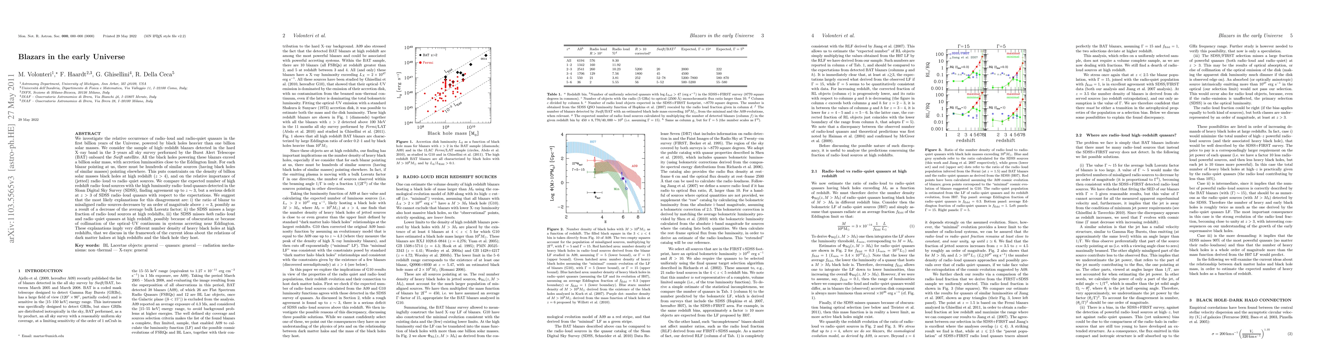 We investigate the relative occurrence of radio--loud and radio-quiet quasars in the first billion years of the Universe, powered by black holes heavier than one billion solar masses. We consider the sample of high-redshfit blazars detected in the hard X-ray band in the 3-years all sky survey performed by the Burst Alert Telescope (BAT) onboard the Swift satellite. All the black holes powering these blazars exceed a billion solar mass, with accretion luminosities close to the Eddington limit. For each blazar pointing at us, there must be hundreds of similar sources (having black holes of similar masses) pointing elsewhere. This puts constraints on the density of billion solar masses black holes at high redshift (z>4), and on the relative importance of (jetted) radio-loud vs radio-quiet sources. We compare the expected number of high redshift radio--loud sources with the high luminosity radio-loud quasars detected in the Sloan Digital Sky Survey (SDSS), finding agreement up to z~3, but a serious deficit at z>3 of SDSS radio-loud quasars with respect to the expectations. We suggest that the most likely explanations for this disagreement are: i) the ratio of blazar to misaligned radio-sources decreases by an order of magnitude above z=3, possibly as a result of a decrease of the average bulk Lorentz factor; ii) the SDSS misses a large fraction of radio-loud sources at high redshifts, iii) the SDSS misses both radio-loud and radio-quiet quasars at high redshift, possibly because of obscuration or because of collimation of the optical-UV continuum in systems accreting near Eddington. These explanations imply very different number density of heavy black holes at high redshifts, that we discuss in the framework of the current ideas about the relations of dark matter haloes at high redshifts and the black hole they host.