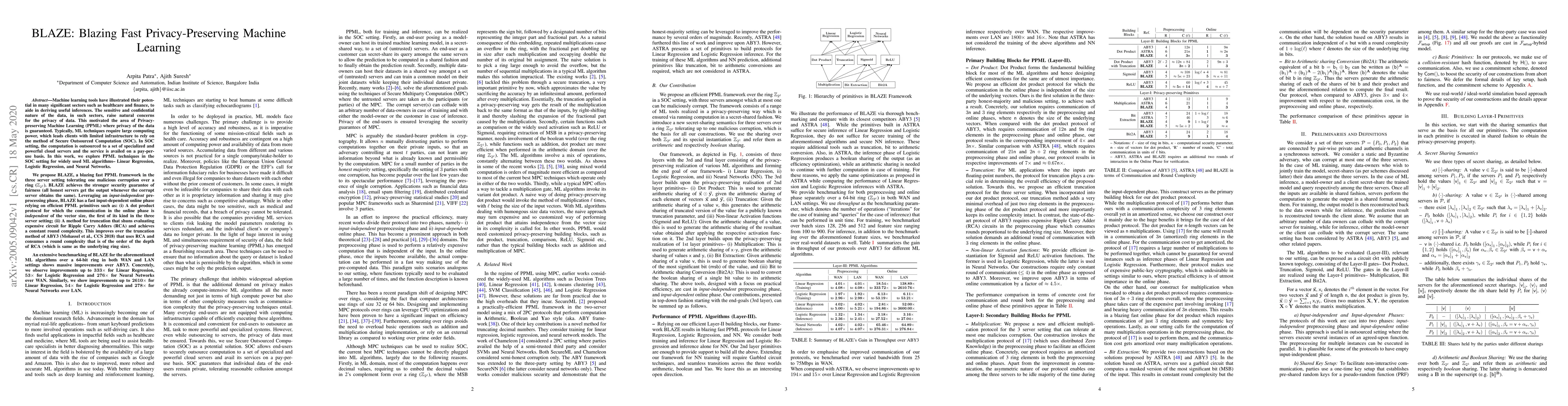 Researchers introduced BLAZE, a fast privacy-preserving machine learning framework that outperforms existing methods in terms of speed and security, enabling widespread adoption of ML in sensitive sectors like healthcare and finance.