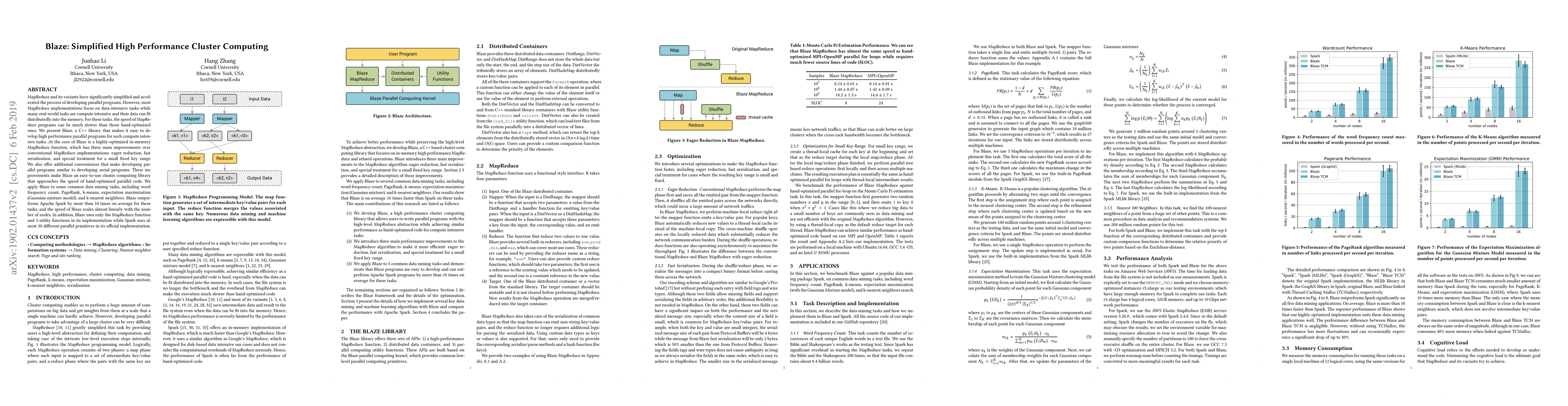 Blaze is a C++ library for high-performance, in-memory cluster computing, designed for compute-intensive tasks. It outperforms Apache Spark by more than 10 times on various data mining tasks, offering simpler implementation with only 33 essential functions, and scales nearly linearly with the number of nodes.