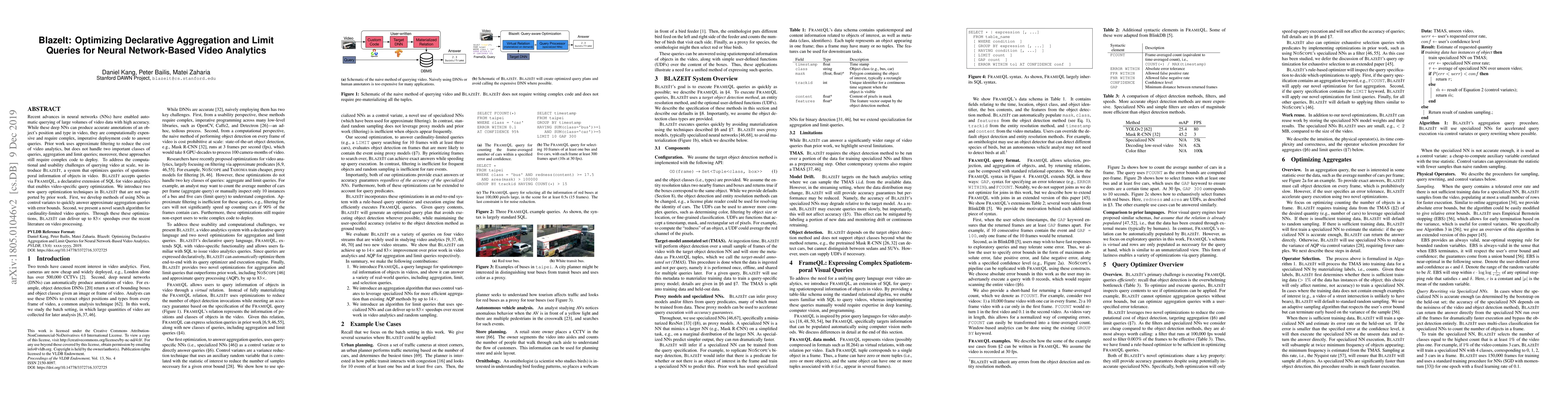 BlazeIt optimizes neural network-based video analytics for declarative aggregation and limit queries, offering up to 83x speedups over existing methods by using NNs as control variates and a novel search algorithm for cardinality-limited queries.
