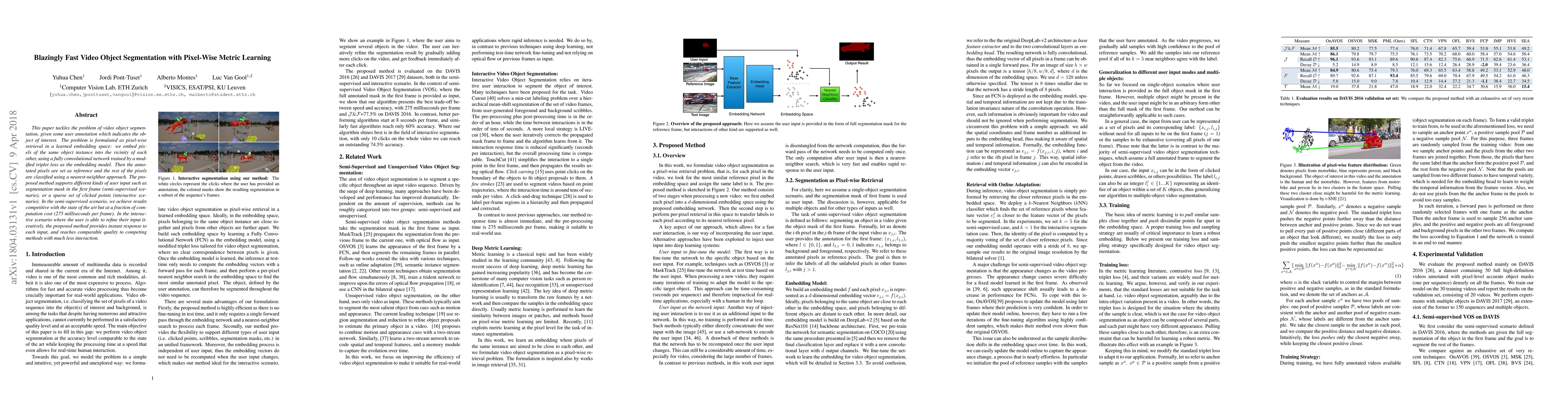 This paper introduces a method for fast video object segmentation using pixel-wise metric learning, achieving competitive results in semi-supervised and interactive scenarios while reducing computation cost.