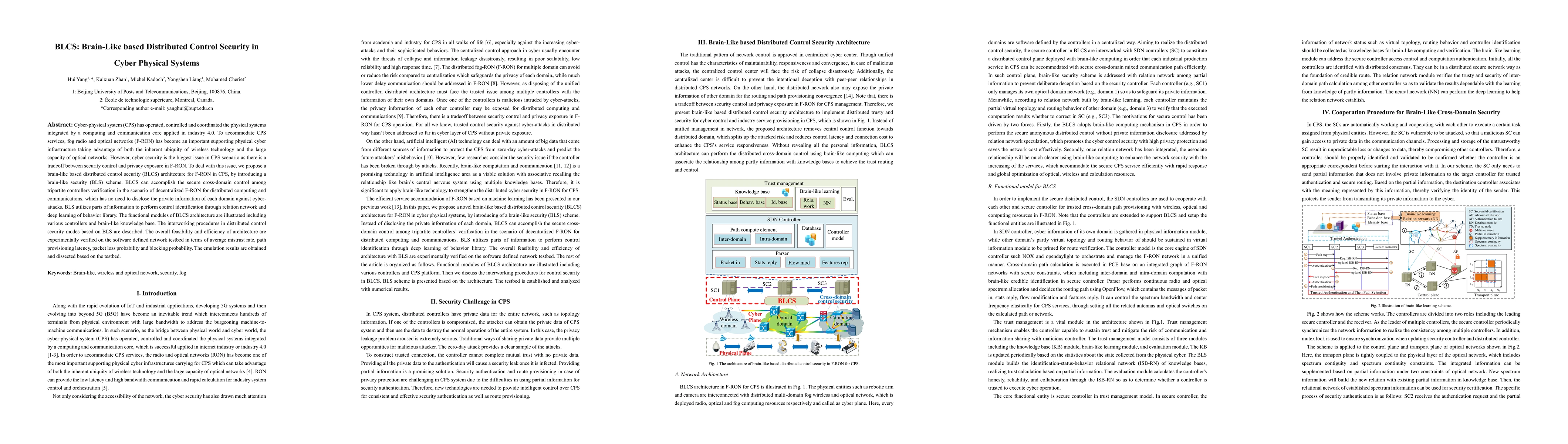 This paper proposes a brain-like based distributed control security (BLCS) architecture for fog radio and optical networks (F-RON) in cyber-physical systems (CPS), addressing the security challenges while maintaining privacy. The BLCS architecture utilizes a brain-like security scheme to enable secure cross-domain control verification without exposing private information, leveraging deep learning and relation networks. Experimental results on a software-defined network testbed demonstrate the feasibility and efficiency of the proposed approach.
