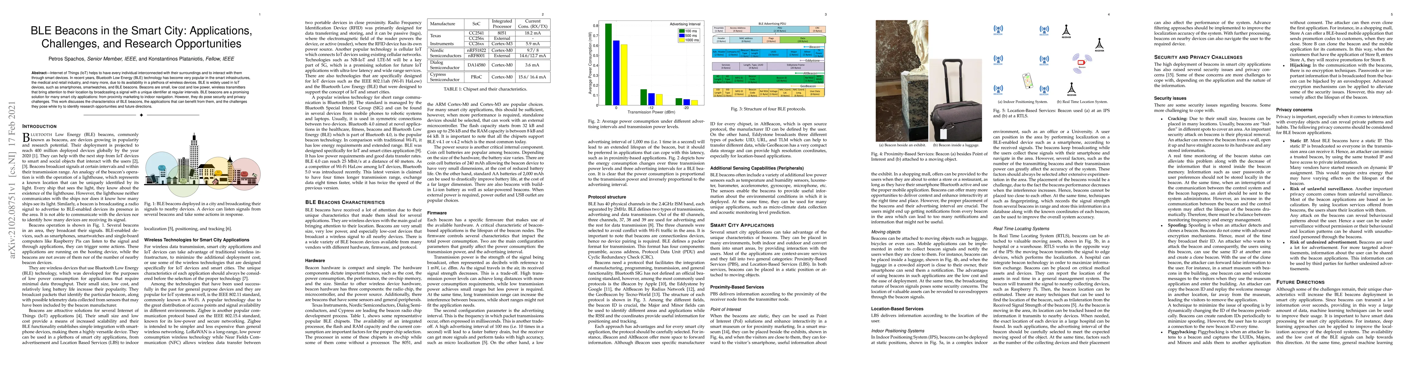The Internet of Things helps to have every individual interconnected with their surroundings and to interact with them through smart devices. In recent years, Bluetooth Low Energy (BLE) technology has become very popular in smart infrastructures, the medical field, the retail industry, and many more areas due to its availability in a plethora of wireless devices. BLE is widely used in IoT devices, such as smartphones, smart watches, and BLE beacons. Beacons are small, low-cost, and low-power wireless transmitters that bring attention to their location by broadcasting a signal with a unique identifier at regular intervals. BLE beacons are a promising solution for many smart city applications, from proximity marketing to indoor navigation. However, they do pose security and privacy challenges. This work discusses the characteristics of BLE beacons, the applications that can benefit from them, and the challenges they pose while trying to identify research opportunities and future directions.