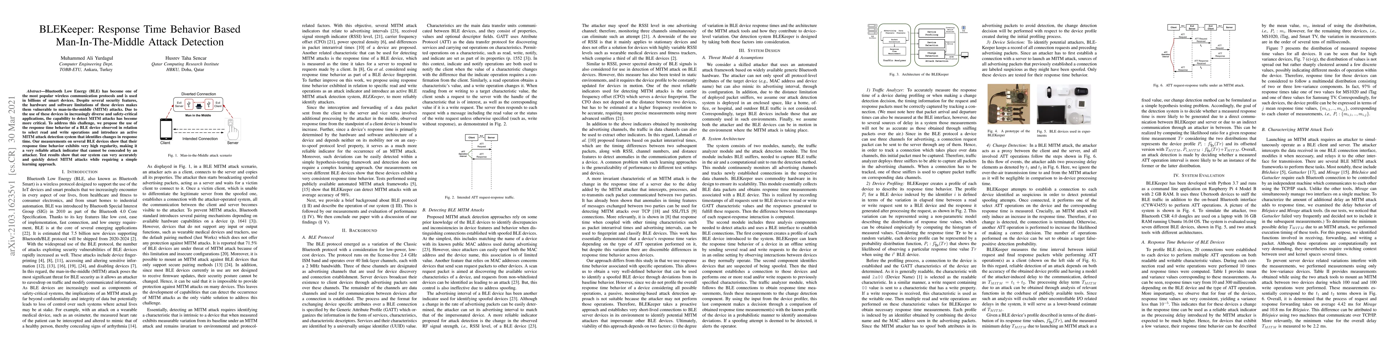 The paper proposes BLEKeeper, an active MITM attack detection system for Bluetooth Low Energy (BLE) devices based on the regularity of response time behavior during read and write operations. The system accurately detects changes in response time, indicating potential MITM attacks, and demonstrates high reliability and effectiveness with minimal computational overhead.