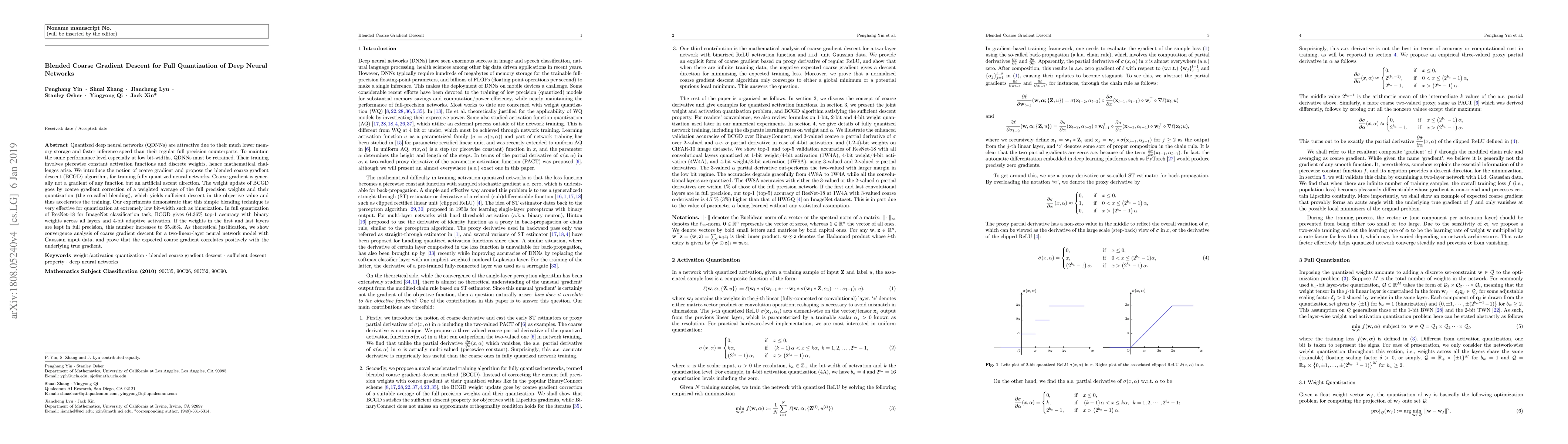 This paper introduces a blended coarse gradient descent (BCGD) algorithm for training fully quantized deep neural networks, addressing the challenges of training with discrete weights and activations. The BCGD method blends full precision weights with their quantized versions, using coarse gradient corrections to maintain performance at low bit-widths, achieving 64.36% top-1 accuracy in binarized ResNet-18 for ImageNet classification.