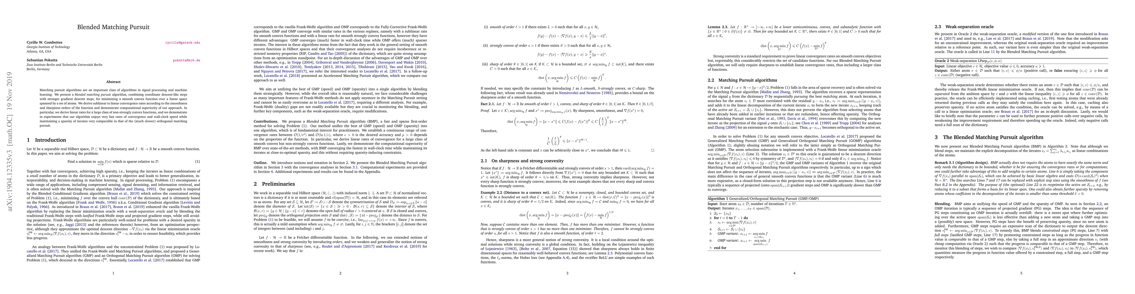 The Blended Matching Pursuit algorithm combines coordinate descent and gradient descent to efficiently minimize smooth convex functions over linear spaces. It achieves sublinear to linear convergence rates, demonstrating computational superiority and faster convergence compared to traditional methods while maintaining comparable sparsity.