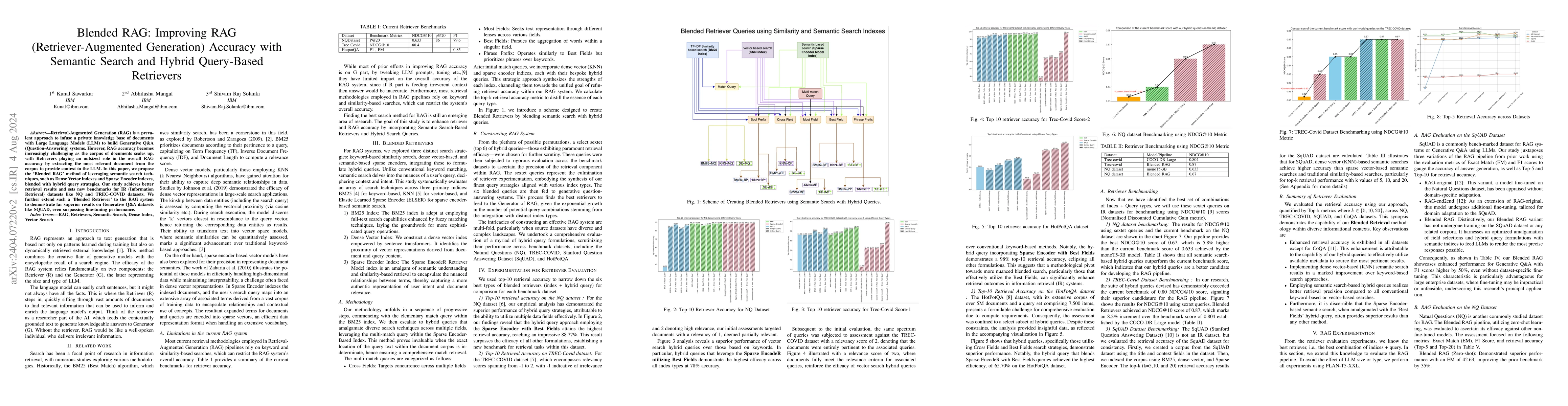 Title: Blended RAG: Improving RAG Accuracy with Semantic Search and Hybrid Query-Based Retrievers Summary: This paper introduces 'Blended RAG,' an advanced method combining semantic search techniques and hybrid query-based retrievers to enhance the accuracy of Retrieval-Augmented Generation systems, achieving superior performance on both information retrieval and generative question-answering datasets.