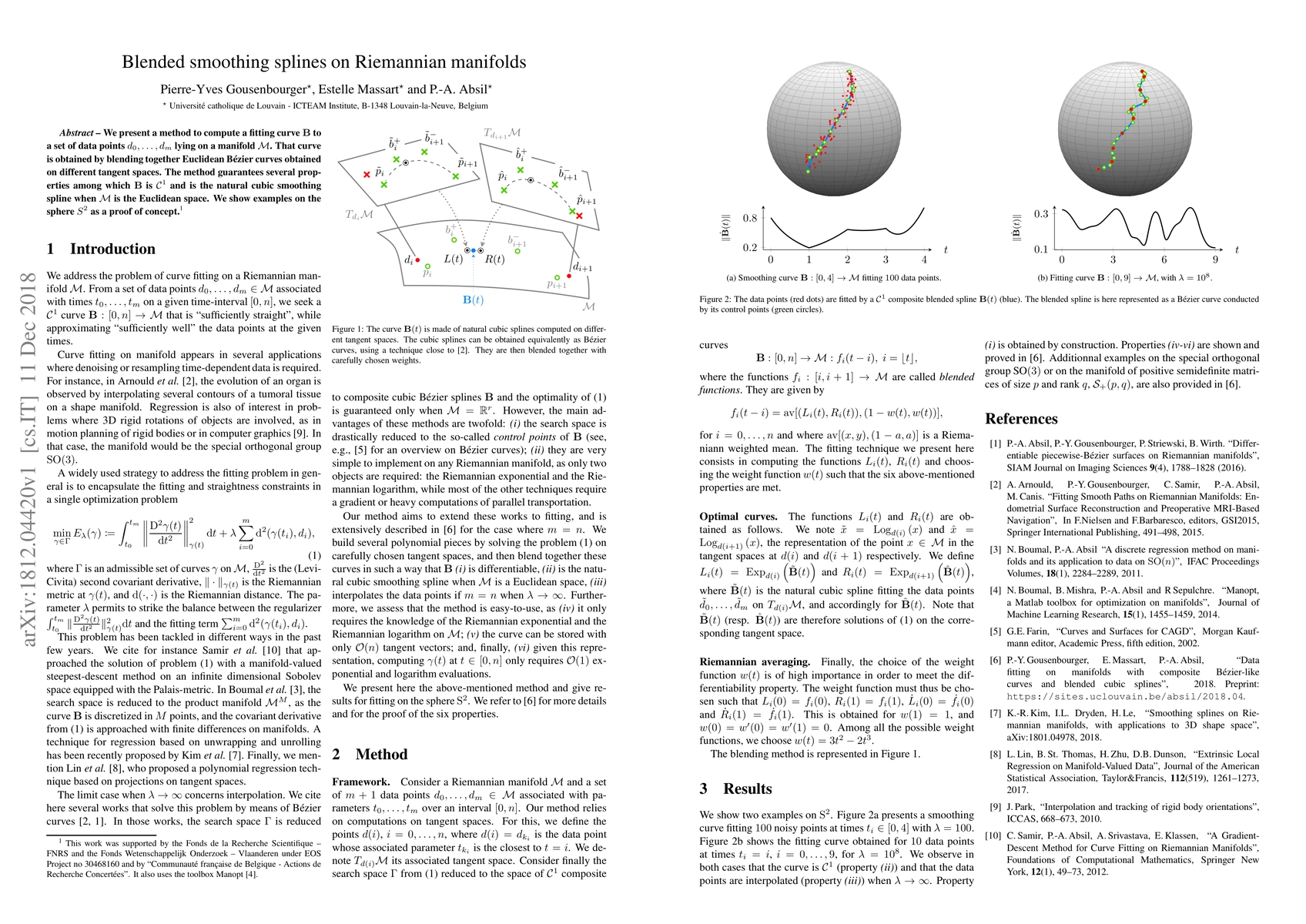 Researchers developed a method to create smooth curves on curved spaces like spheres by blending Euclidean Bezier curves, ensuring the resulting curve is C1 and meets certain smoothing criteria.