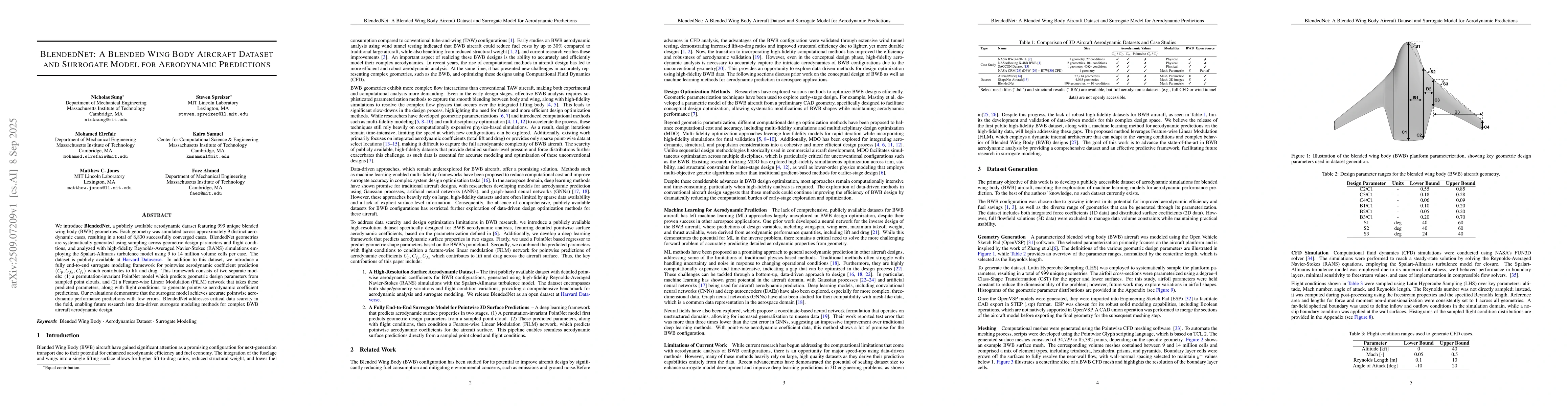 BlendedNet is a publicly available aerodynamic dataset of 999 blended wing body (BWB) geometries. Each geometry is simulated across about nine flight conditions, yielding 8830 converged RANS cases with the Spalart-Allmaras model and 9 to 14 million cells per case. The dataset is generated by sampling geometric design parameters and flight conditions, and includes detailed pointwise surface quantities needed to study lift and drag. We also introduce an end-to-end surrogate framework for pointwise aerodynamic prediction. The pipeline first uses a permutation-invariant PointNet regressor to predict geometric parameters from sampled surface point clouds, then conditions a Feature-wise Linear Modulation (FiLM) network on the predicted parameters and flight conditions to predict pointwise coefficients Cp, Cfx, and Cfz. Experiments show low errors in surface predictions across diverse BWBs. BlendedNet addresses data scarcity for unconventional configurations and enables research on data-driven surrogate modeling for aerodynamic design.