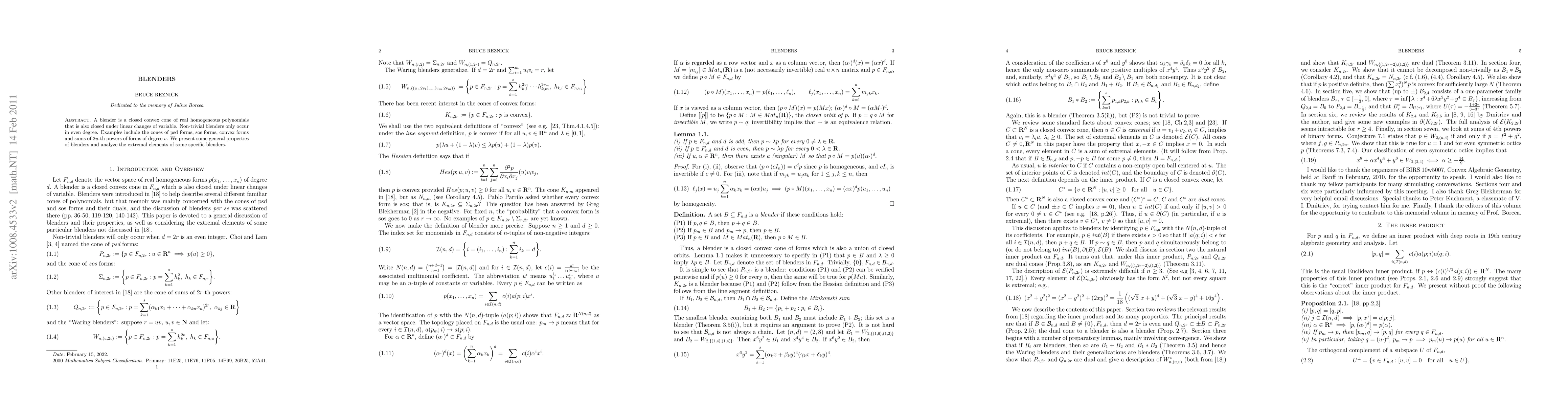 A blender is a closed convex cone of real homogeneous polynomials that is also closed under linear changes of variable. Non-trivial blenders only occur in even degree. Examples include the cones of psd forms, sos forms, convex forms and sums of $2u$-th powers of forms of degree $v$. We present some general properties of blenders and analyze the extremal elements of some specific blenders.
