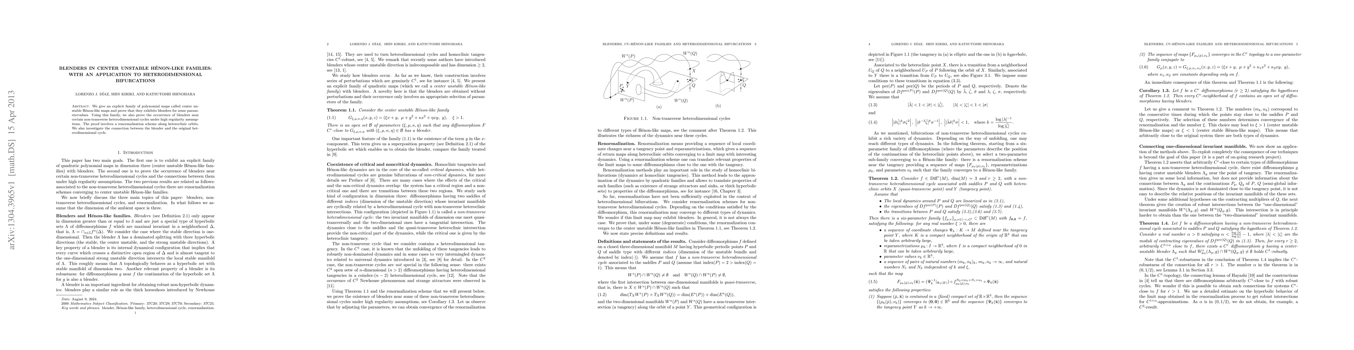 We give an explicit family of polynomial maps called center unstable H\'enon-like maps and prove that they exhibits blenders for some parametervalues. Using this family, we also prove the occurrence of blenders near certain non-transverse heterodimensional cycles under high regularity assumptions. The proof involves a renormalization scheme along heteroclinic orbits. We also investigate the connection between the blender and the original heterodimensional cycle.