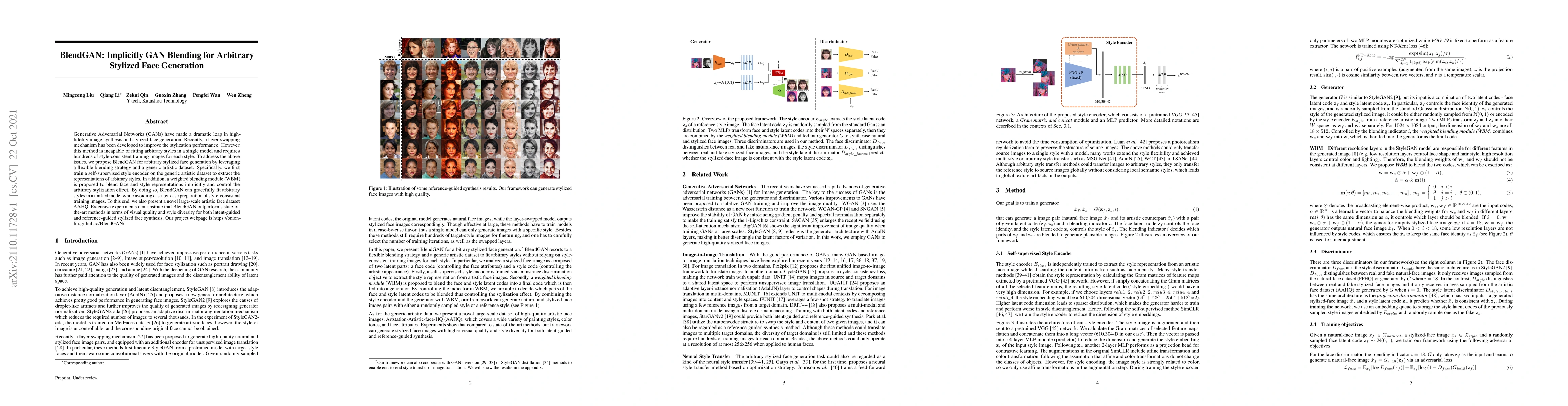 BlendGAN generates stylized faces with arbitrary styles using a novel blending strategy, overcoming the need for hundreds of style-consistent images.