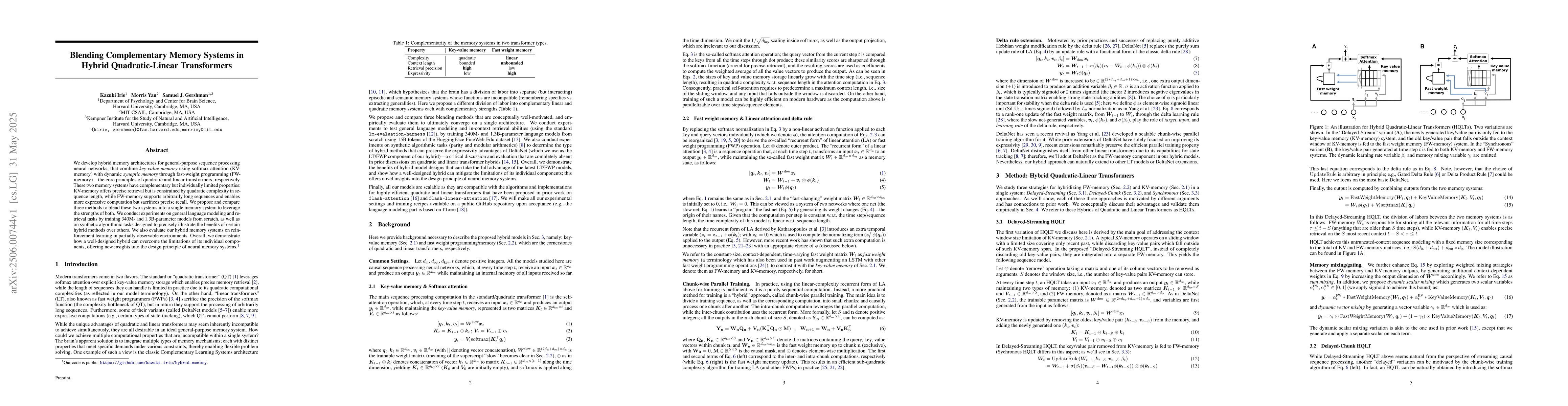 We develop hybrid memory architectures for general-purpose sequence processing neural networks, that combine key-value memory using softmax attention (KV-memory) with dynamic synaptic memory through fast-weight programming (FW-memory) -- the core principles of quadratic and linear transformers, respectively. These two memory systems have complementary but individually limited properties: KV-memory offers precise retrieval but is constrained by quadratic complexity in sequence length, while FW-memory supports arbitrarily long sequences and enables more expressive computation but sacrifices precise recall. We propose and compare three methods to blend these two systems into a single memory system to leverage the strengths of both. We conduct experiments on general language modeling and retrieval tasks by training 340M- and 1.3B-parameter models from scratch, as well as on synthetic algorithmic tasks designed to precisely illustrate the benefits of certain hybrid methods over others. We also evaluate our hybrid memory systems on reinforcement learning in partially observable environments. Overall, we demonstrate how a well-designed hybrid can overcome the limitations of its individual components, offering new insights into the design principle of neural memory systems.