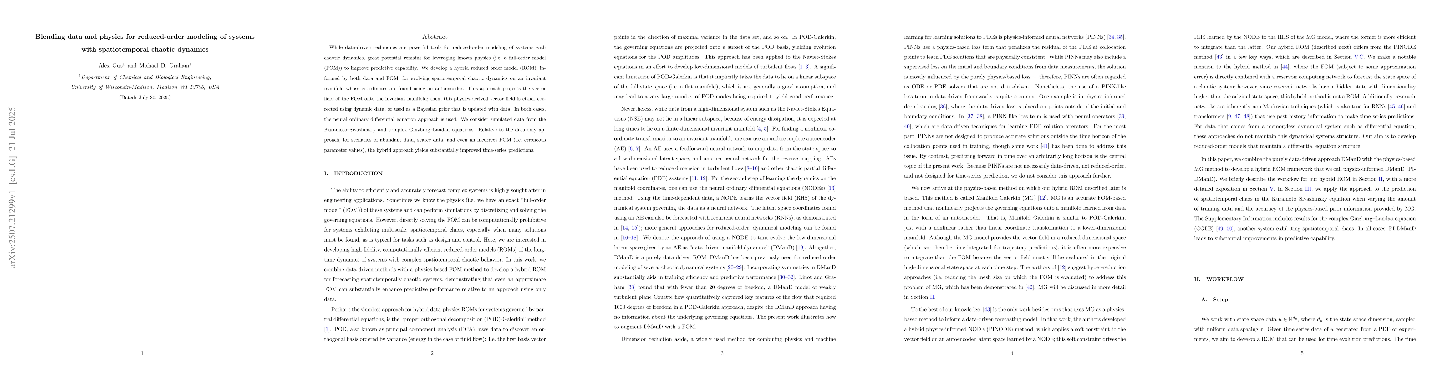 While data-driven techniques are powerful tools for reduced-order modeling of systems with chaotic dynamics, great potential remains for leveraging known physics (i.e. a full-order model (FOM)) to improve predictive capability. We develop a hybrid reduced order model (ROM), informed by both data and FOM, for evolving spatiotemporal chaotic dynamics on an invariant manifold whose coordinates are found using an autoencoder. This approach projects the vector field of the FOM onto the invariant manifold; then, this physics-derived vector field is either corrected using dynamic data, or used as a Bayesian prior that is updated with data. In both cases, the neural ordinary differential equation approach is used. We consider simulated data from the Kuramoto-Sivashinsky and complex Ginzburg-Landau equations. Relative to the data-only approach, for scenarios of abundant data, scarce data, and even an incorrect FOM (i.e. erroneous parameter values), the hybrid approach yields substantially improved time-series predictions.