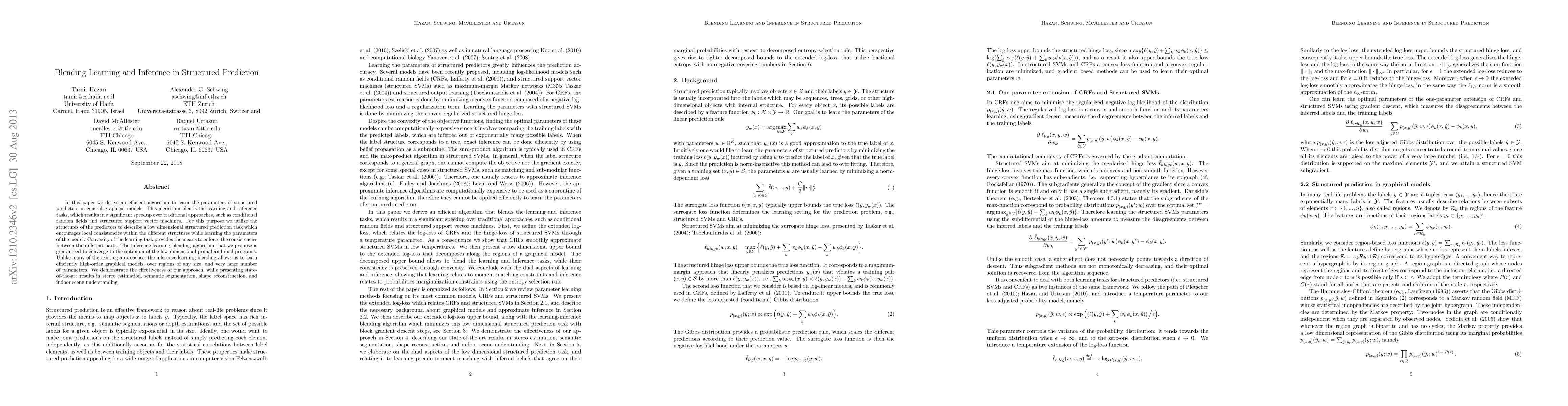 In this paper we derive an efficient algorithm to learn the parameters of structured predictors in general graphical models. This algorithm blends the learning and inference tasks, which results in a significant speedup over traditional approaches, such as conditional random fields and structured support vector machines. For this purpose we utilize the structures of the predictors to describe a low dimensional structured prediction task which encourages local consistencies within the different structures while learning the parameters of the model. Convexity of the learning task provides the means to enforce the consistencies between the different parts. The inference-learning blending algorithm that we propose is guaranteed to converge to the optimum of the low dimensional primal and dual programs. Unlike many of the existing approaches, the inference-learning blending allows us to learn efficiently high-order graphical models, over regions of any size, and very large number of parameters. We demonstrate the effectiveness of our approach, while presenting state-of-the-art results in stereo estimation, semantic segmentation, shape reconstruction, and indoor scene understanding.