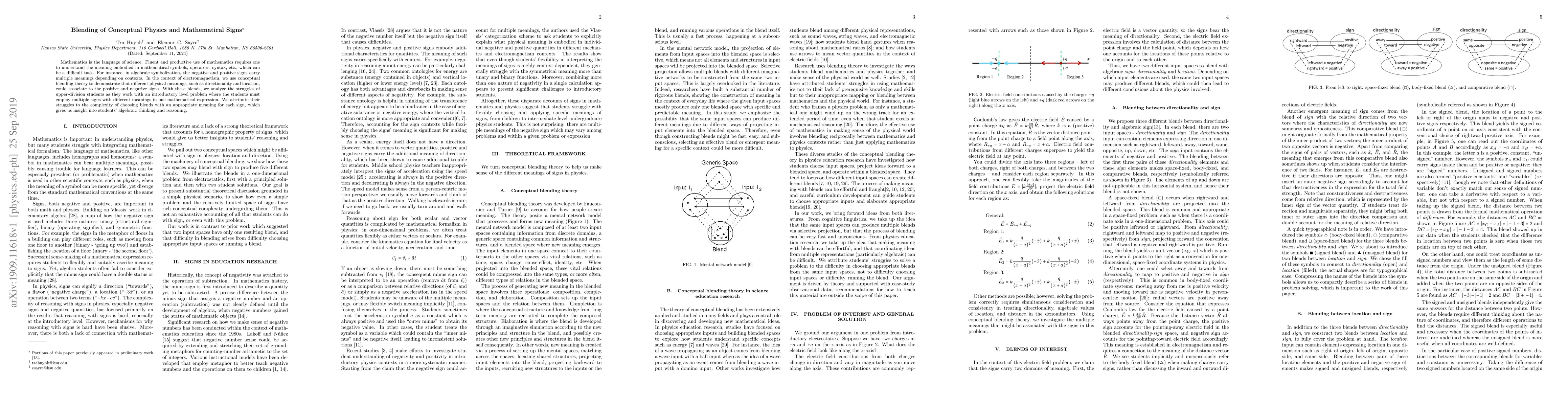 This paper explores how conceptual blending theory can elucidate the multiple meanings of mathematical signs in physics, particularly in electromagnetism. It identifies students' difficulties in choosing appropriate blends for signs, providing insight into their algebraic thinking and reasoning.
