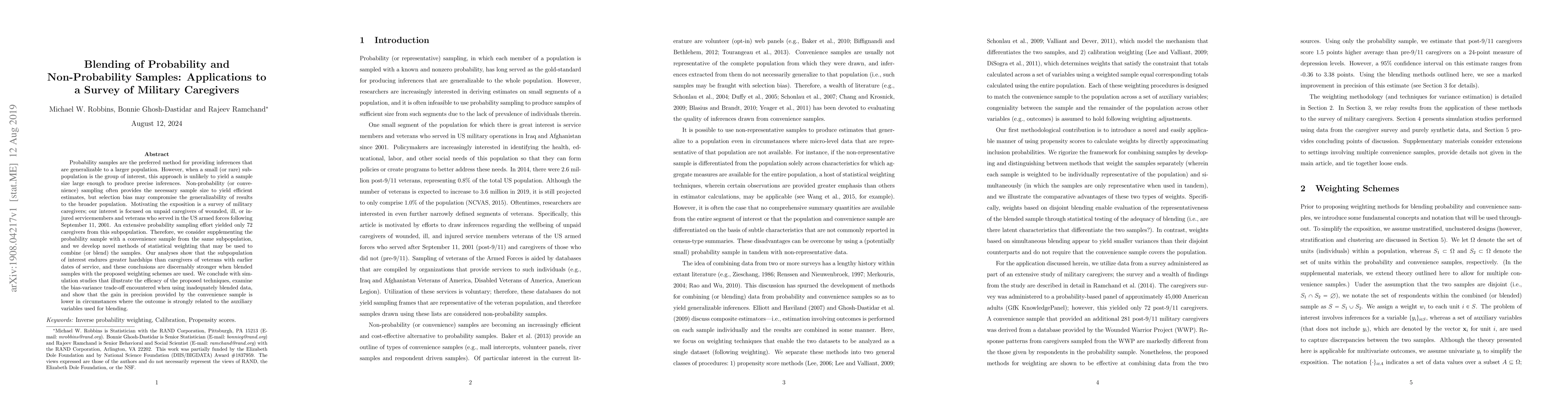 This research proposes blending probability and non-probability samples to study small, specific subpopulations, like military caregivers, where traditional probability sampling fails. The method involves weighting statistics from a smaller, more representative probability sample and a larger, less representative convenience sample, enhancing the precision of conclusions about the subpopulation's hardships. Simulation studies validate the technique, showing its efficacy while highlighting potential bias-variance trade-offs.
