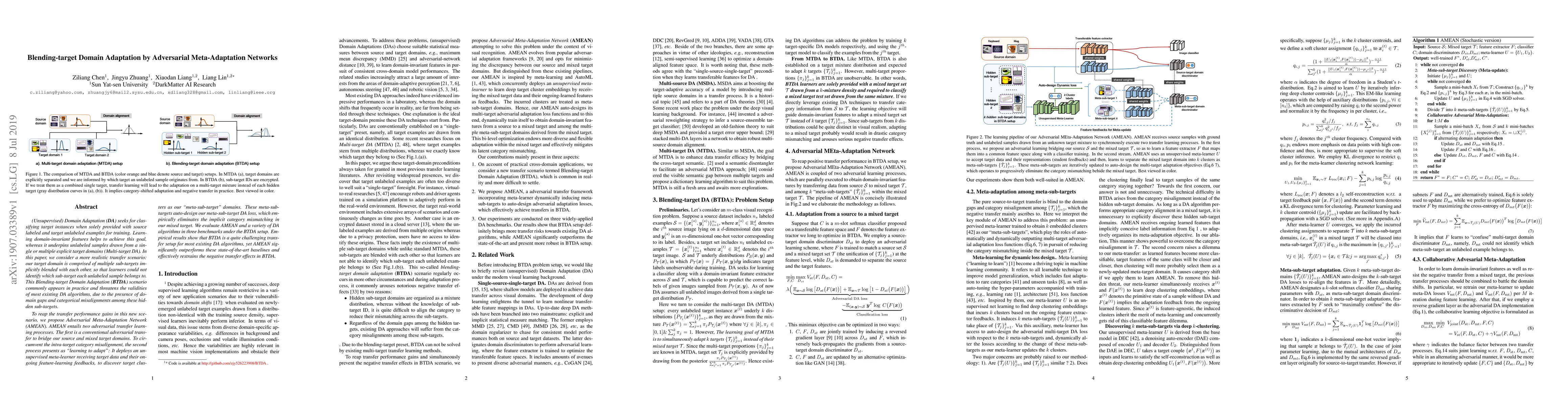 This paper proposes Adversarial Meta-Adaptation Network (AMEAN) to tackle the Blending-target Domain Adaptation (BTDA) scenario, where target domains are implicitly blended without clear sub-target identification. AMEAN employs two adversarial processes to bridge source and mixed target domains and to discover and adapt to meta-sub-target domains, achieving superior performance over existing domain adaptation algorithms.