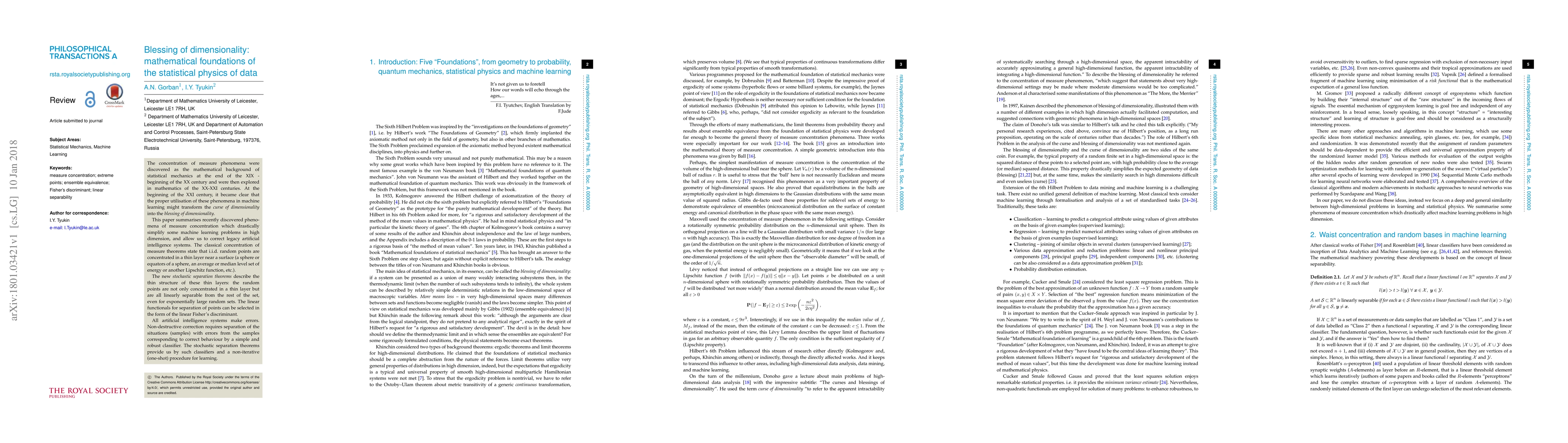 The concentration of measure phenomena were discovered as the mathematical background of statistical mechanics at the end of the XIX - beginning of the XX century and were then explored in mathematics of the XX-XXI centuries. At the beginning of the XXI century, it became clear that the proper utilisation of these phenomena in machine learning might transform the curse of dimensionality into the blessing of dimensionality. This paper summarises recently discovered phenomena of measure concentration which drastically simplify some machine learning problems in high dimension, and allow us to correct legacy artificial intelligence systems. The classical concentration of measure theorems state that i.i.d. random points are concentrated in a thin layer near a surface (a sphere or equators of a sphere, an average or median level set of energy or another Lipschitz function, etc.). The new stochastic separation theorems describe the thin structure of these thin layers: the random points are not only concentrated in a thin layer but are all linearly separable from the rest of the set, even for exponentially large random sets. The linear functionals for separation of points can be selected in the form of the linear Fisher's discriminant. All artificial intelligence systems make errors. Non-destructive correction requires separation of the situations (samples) with errors from the samples corresponding to correct behaviour by a simple and robust classifier. The stochastic separation theorems provide us by such classifiers and a non-iterative (one-shot) procedure for learning.