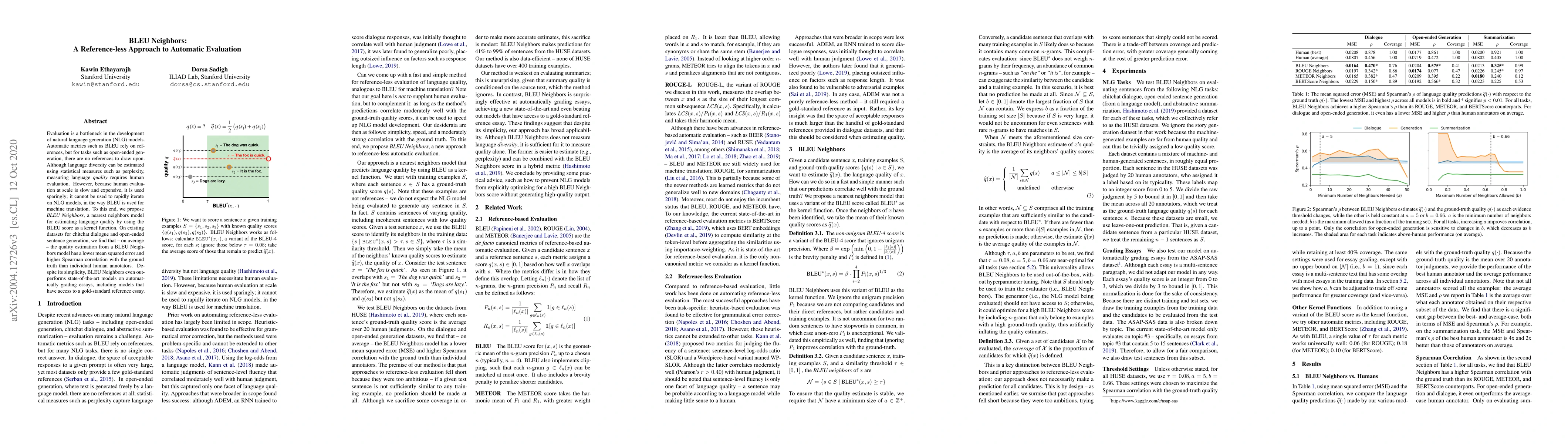 The paper proposes BLEU Neighbors, a reference-less approach to evaluate natural language generation models by using BLEU scores as a kernel function. It demonstrates that BLEU Neighbors can estimate language quality more accurately than individual human annotators, and outperforms existing automatic grading models, even those with reference essays.