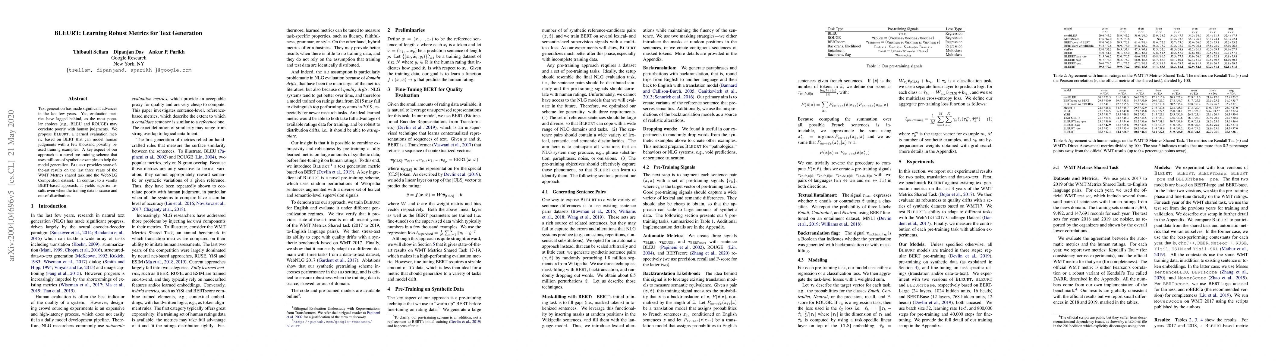 Text generation has made significant advances in the last few years. Yet, evaluation metrics have lagged behind, as the most popular choices (e.g., BLEU and ROUGE) may correlate poorly with human judgments. We propose BLEURT, a learned evaluation metric based on BERT that can model human judgments with a few thousand possibly biased training examples. A key aspect of our approach is a novel pre-training scheme that uses millions of synthetic examples to help the model generalize. BLEURT provides state-of-the-art results on the last three years of the WMT Metrics shared task and the WebNLG Competition dataset. In contrast to a vanilla BERT-based approach, it yields superior results even when the training data is scarce and out-of-distribution.
