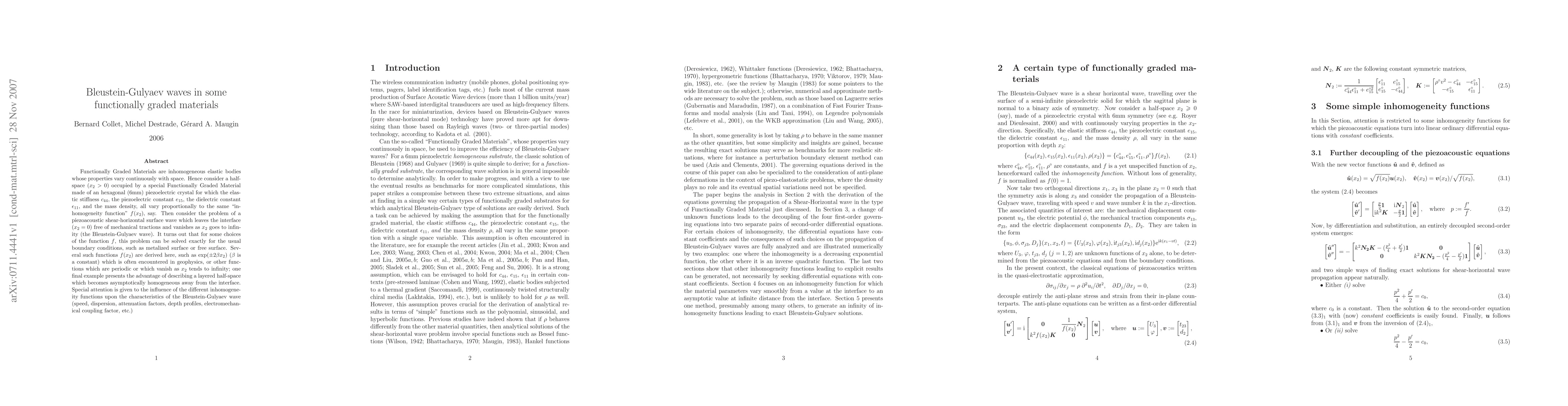 Functionally Graded Materials are inhomogeneous elastic bodies whose properties vary continuously with space. Hence consider a half-space (x_2>0) occupied by a special Functionally Graded Material made of an hexagonal (6 mm) piezoelectric crystal for which the elastic stiffness c44, the piezoelectric constant e15, the dielectric constant epsilon11, and the mass density, all vary proportionally to the same "inhomogeneity function" f(x_2), say. Then consider the problem of a piezoacoustic shear-horizontal surface wave which leaves the interface (x_2=0) free of mechanical tractions and vanishes as x_2 goes to infinity (the Bleustein-Gulyaev wave). It turns out that for some choices of the function f, this problem can be solved exactly for the usual boundary conditions, such as metalized surface or free surface. Several such functions f(x_2) are derived here, such as exp($\pm 2\beta x_2) (\beta is a constant) which is often encountered in geophysics, or other functions which are periodic or which vanish as x_2 tends to infinity; one final example presents the advantage of describing a layered half-space which becomes asymptotically homogeneous away from the interface. Special attention is given to the influence of the different inhomogeneity functions upon the characteristics of the Bleustein-Gulyaev wave (speed, dispersion, attenuation factors, depth profiles, electromechanical coupling factor, etc.)