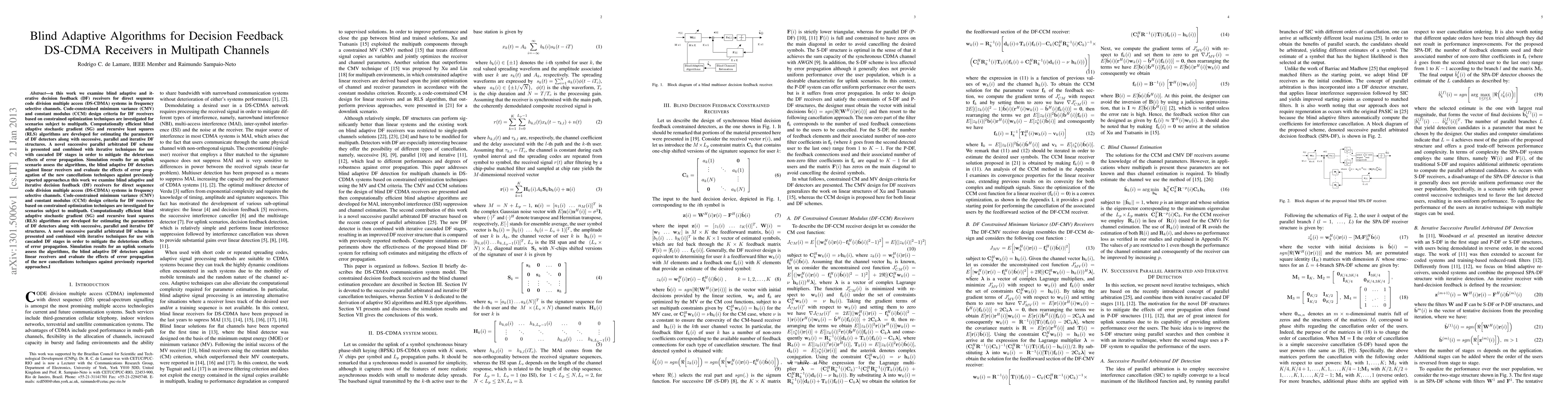 This paper investigates blind adaptive and iterative decision feedback receivers for DS-CDMA systems in multipath channels, developing efficient algorithms and novel cancellation techniques to mitigate error propagation. Simulation results compare the performance of the proposed blind adaptive DF detectors against linear receivers.