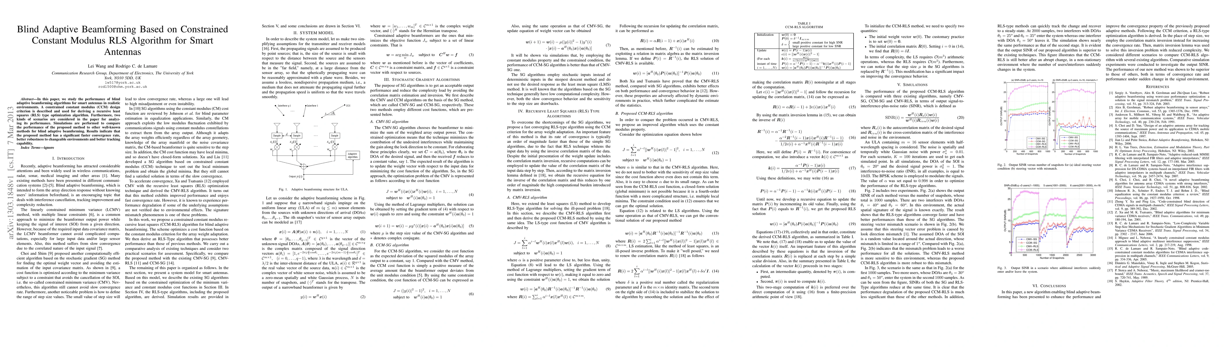 This paper proposes a blind adaptive beamforming algorithm based on the constrained constant modulus RLS for smart antennas, demonstrating faster convergence, enhanced robustness, and superior tracking capability compared to other methods through simulations.