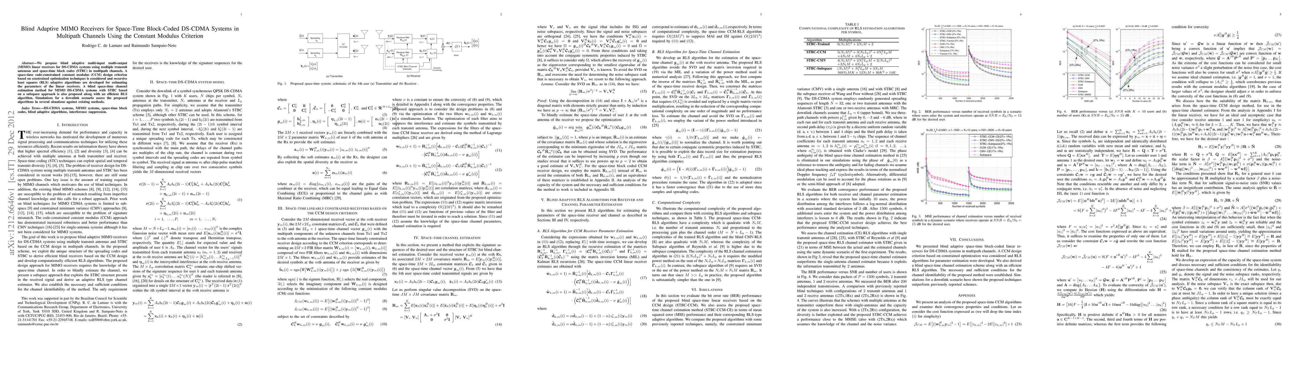 This paper proposes blind adaptive MIMO receivers for DS-CDMA systems employing space-time block codes in multipath channels, utilizing a space-time code-constrained constant modulus criterion and recursive least squares algorithms for parameter estimation. Simulation results demonstrate the effectiveness of the proposed methods against existing techniques.