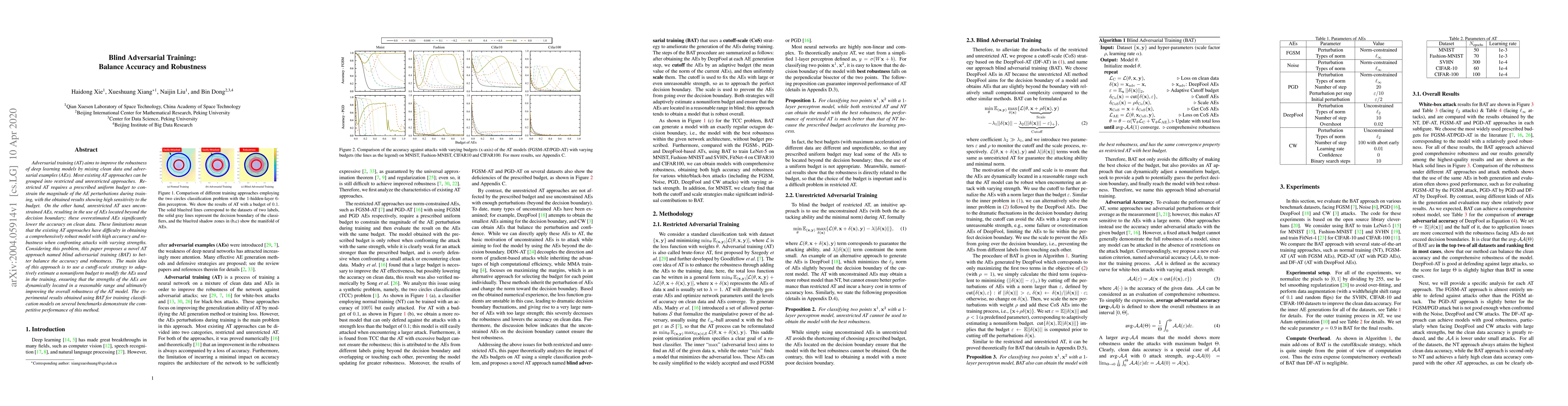 This paper proposes a novel blind adversarial training method to balance accuracy and robustness in deep learning models. By using a cutoff-scale strategy to adaptively estimate a nonuniform budget for adversarial examples, the approach dynamically adjusts perturbation strengths, leading to improved overall robustness without sacrificing accuracy on clean data.