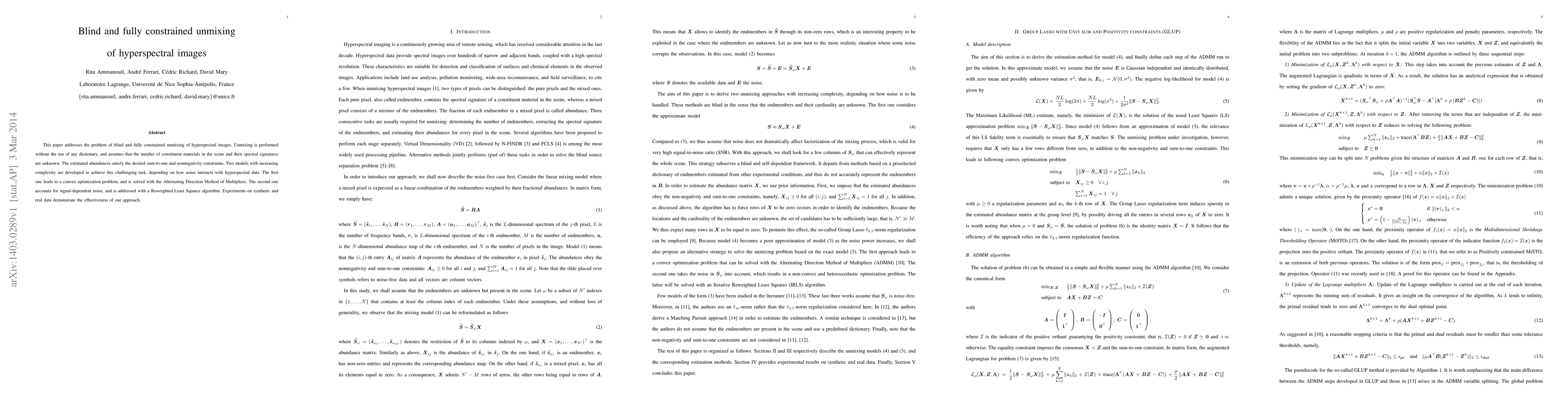 This paper proposes methods for blind unmixing of hyperspectral images without prior knowledge of materials, developing models that satisfy sum-to-one and nonnegativity constraints. The approach includes a convex optimization method and a Reweighted Least Squares algorithm for handling noise, validated through synthetic and real data experiments.