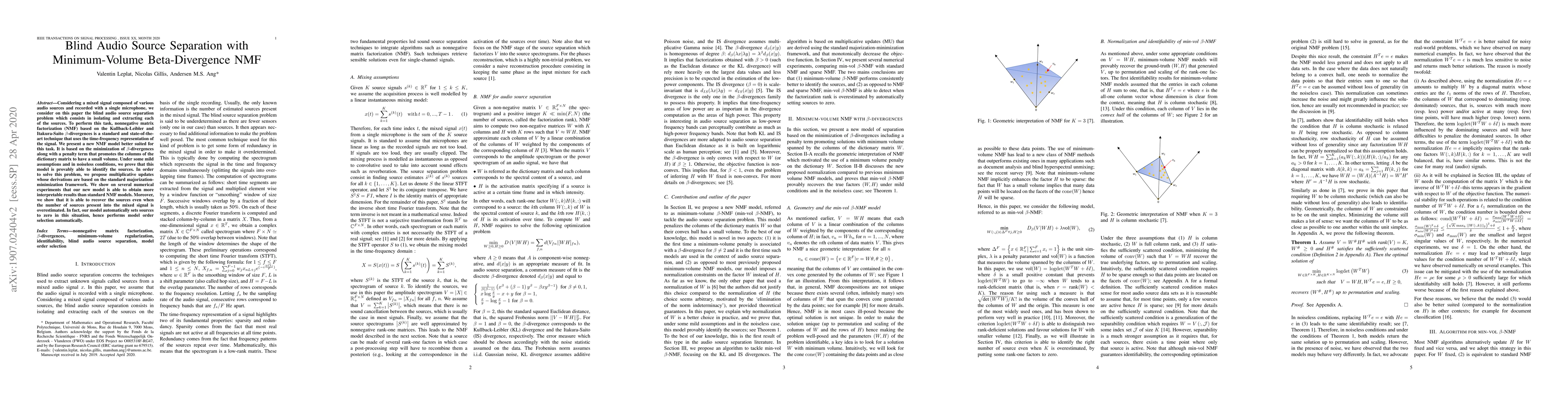 A new NMF model is proposed for blind audio source separation that minimizes beta-divergences with a penalty term to promote column volume, achieving more interpretable results and automatic source order selection.