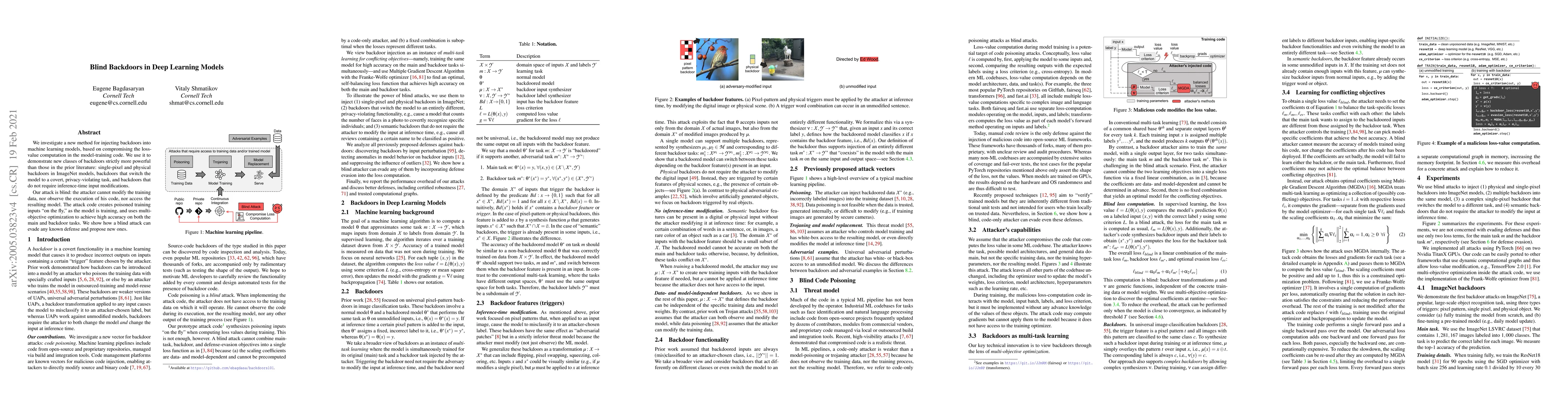 We investigate a new method for injecting backdoors into machine learning models, based on compromising the loss-value computation in the model-training code. We use it to demonstrate new classes of backdoors strictly more powerful than those in the prior literature: single-pixel and physical backdoors in ImageNet models, backdoors that switch the model to a covert, privacy-violating task, and backdoors that do not require inference-time input modifications. Our attack is blind: the attacker cannot modify the training data, nor observe the execution of his code, nor access the resulting model. The attack code creates poisoned training inputs "on the fly," as the model is training, and uses multi-objective optimization to achieve high accuracy on both the main and backdoor tasks. We show how a blind attack can evade any known defense and propose new ones.