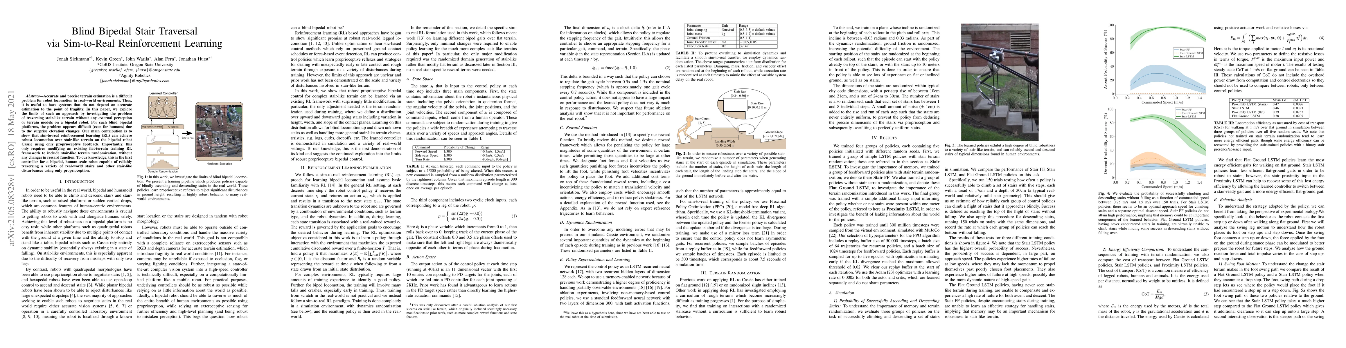 This research distinguishes itself by demonstrating robust blind bipedal stair traversal using only proprioception and sim-to-real RL, without requiring explicit stair-specific reward terms.