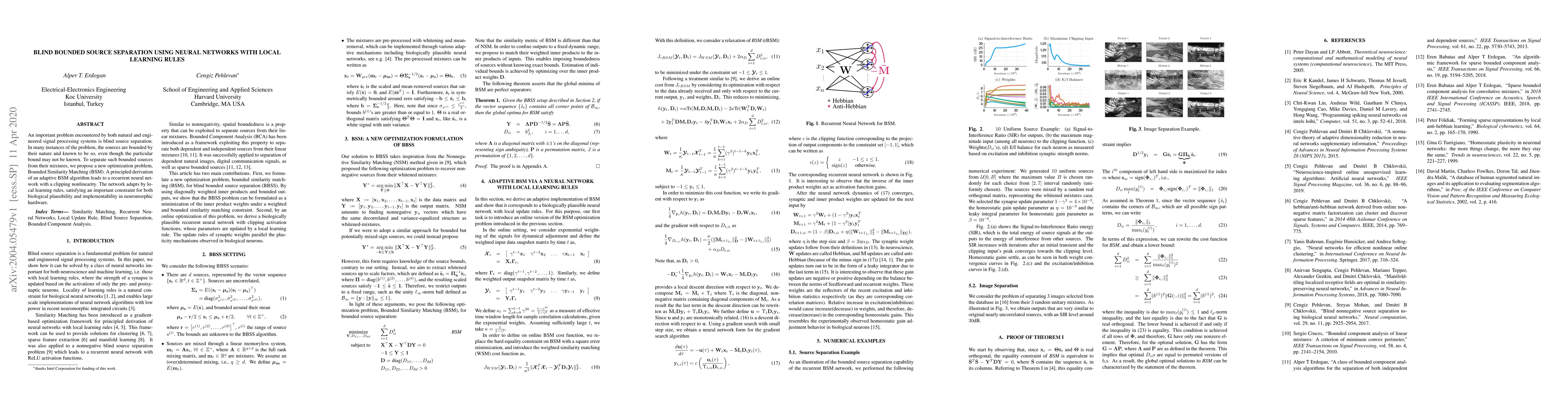 This paper proposes a novel optimization problem, Bounded Similarity Matching (BSM), for blind source separation of bounded sources. It introduces a recurrent neural network with local learning rules and a clipping nonlinearity, which is biologically plausible and suitable for neuromorphic hardware.