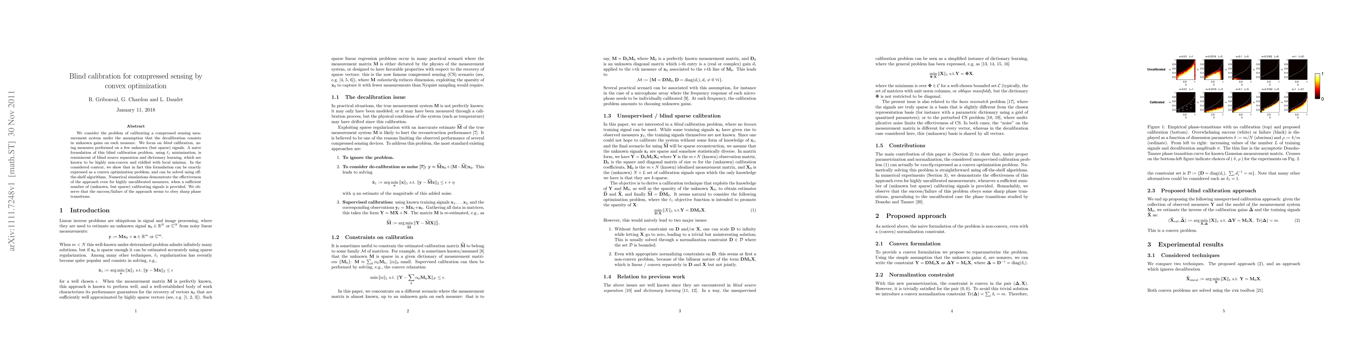 This paper proposes a convex optimization approach for blind calibration in compressed sensing systems, where unknown gains affect measurements. It demonstrates that the calibration problem, typically non-convex, can be reformulated as a convex problem, enabling effective solution via standard algorithms, validated by numerical simulations showing sharp phase transitions in success rates.