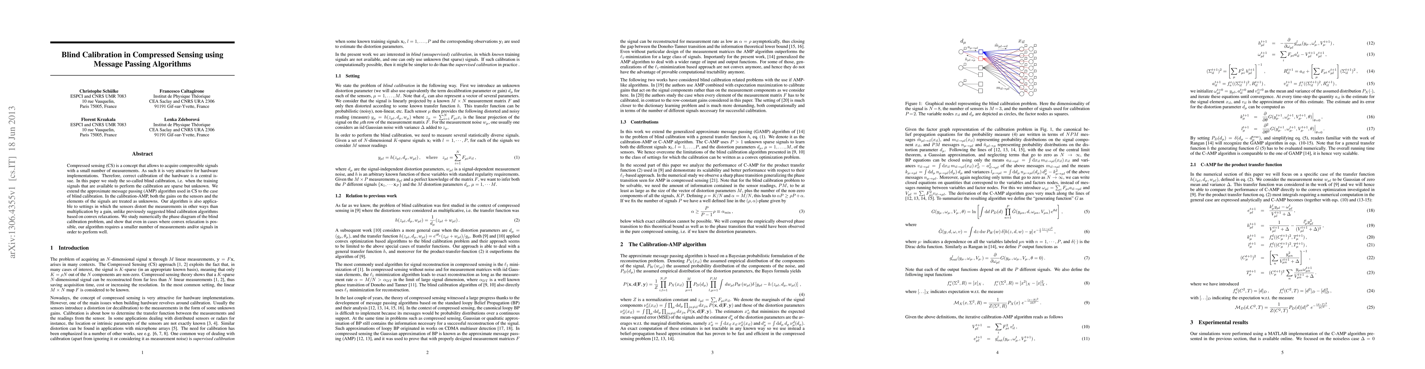 Compressed sensing (CS) is a concept that allows to acquire compressible signals with a small number of measurements. As such it is very attractive for hardware implementations. Therefore, correct calibration of the hardware is a central is- sue. In this paper we study the so-called blind calibration, i.e. when the training signals that are available to perform the calibration are sparse but unknown. We extend the approximate message passing (AMP) algorithm used in CS to the case of blind calibration. In the calibration-AMP, both the gains on the sensors and the elements of the signals are treated as unknowns. Our algorithm is also applica- ble to settings in which the sensors distort the measurements in other ways than multiplication by a gain, unlike previously suggested blind calibration algorithms based on convex relaxations. We study numerically the phase diagram of the blind calibration problem, and show that even in cases where convex relaxation is pos- sible, our algorithm requires a smaller number of measurements and/or signals in order to perform well.
