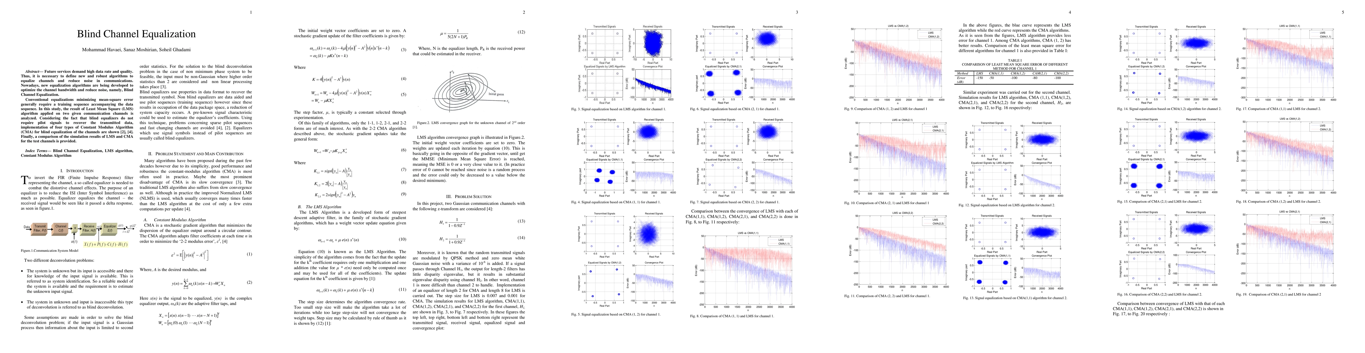 This paper investigates blind channel equalization techniques to enhance data rate and quality without requiring training sequences. It analyzes the Least Mean Square (LMS) algorithm and compares it with four types of Constant Modulus Algorithm (CMA) for equalizing communication channels, demonstrating the effectiveness of blind equalization in reducing noise.